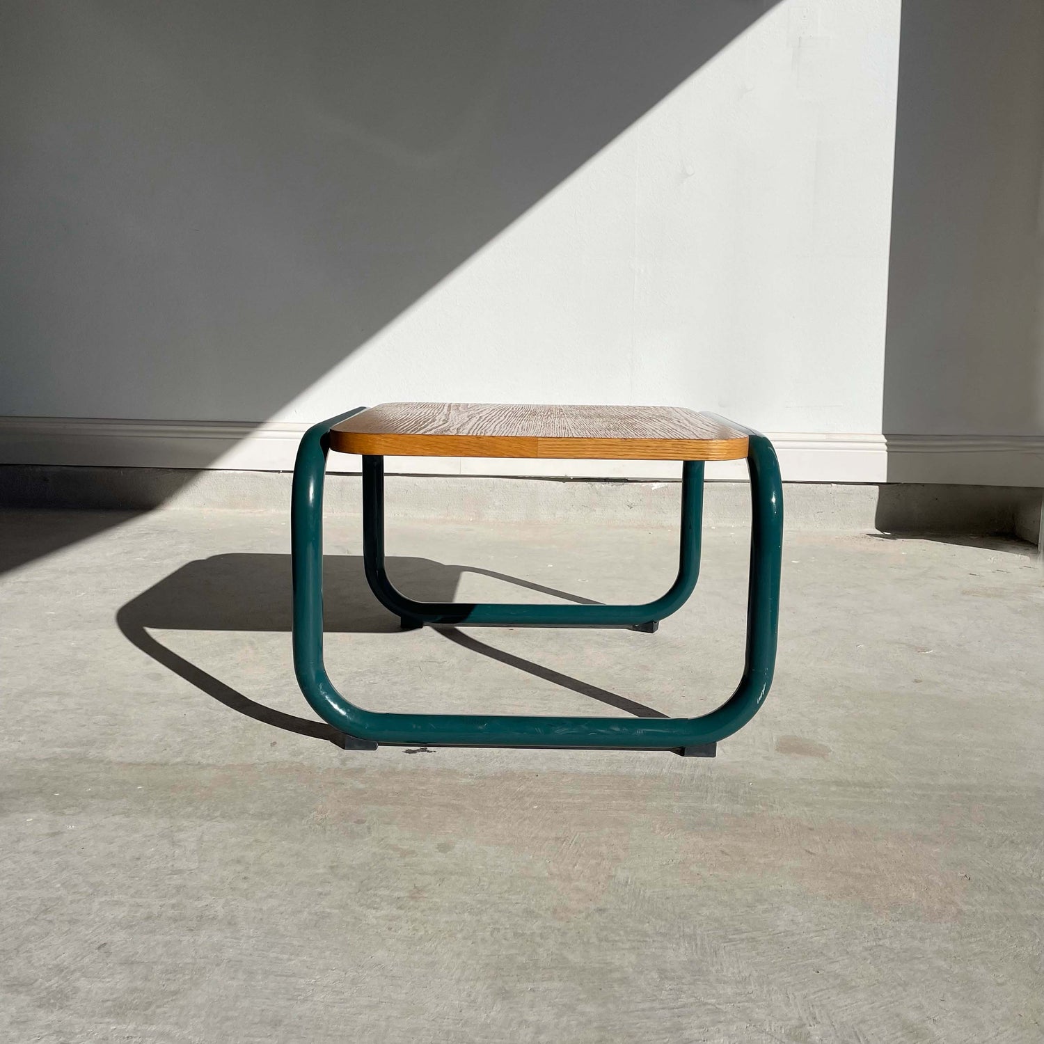 Rare cantilever tubular side table by Hugh Hamilton and Philip Salmon for Kinetics. Made in Canada. Green legs, wood table top.