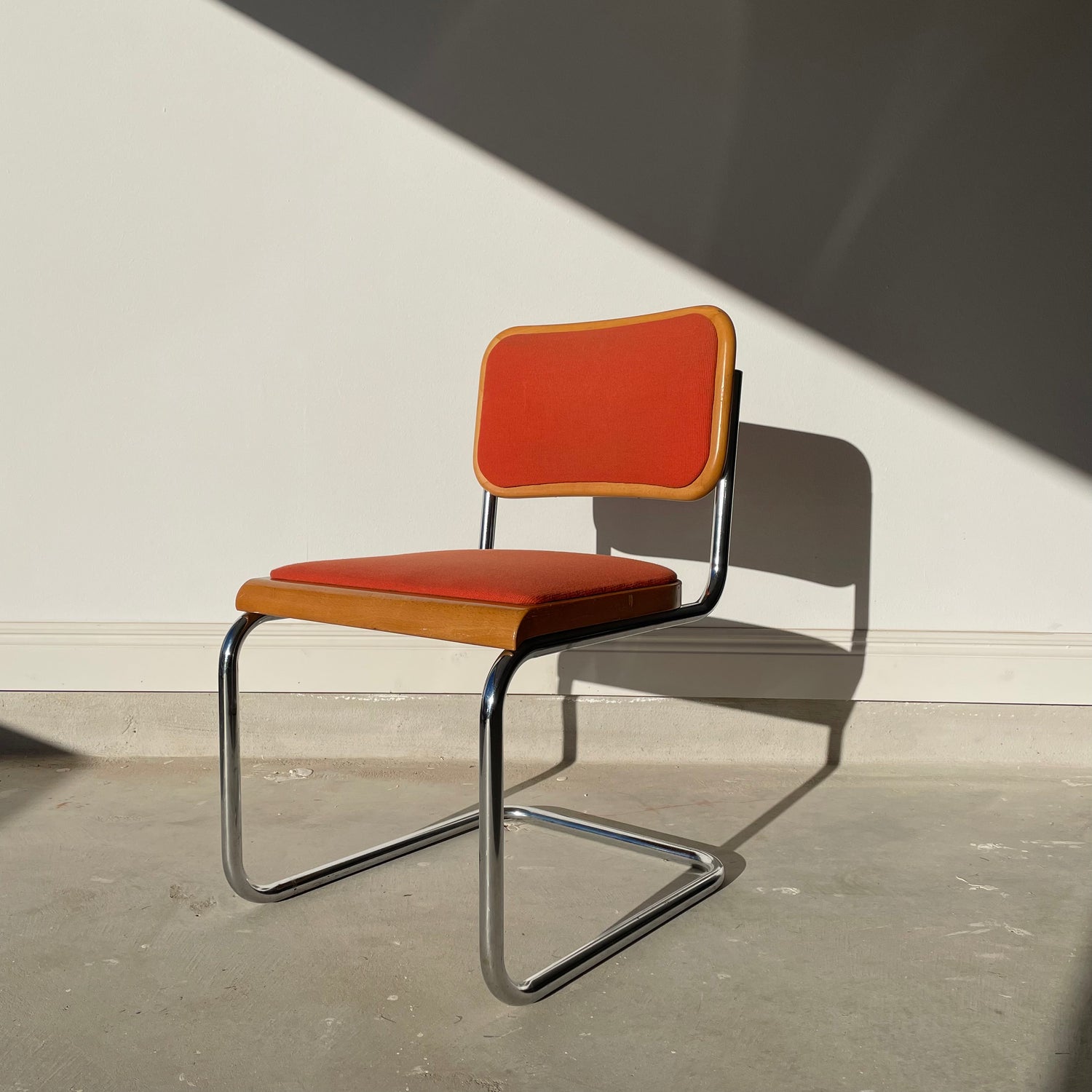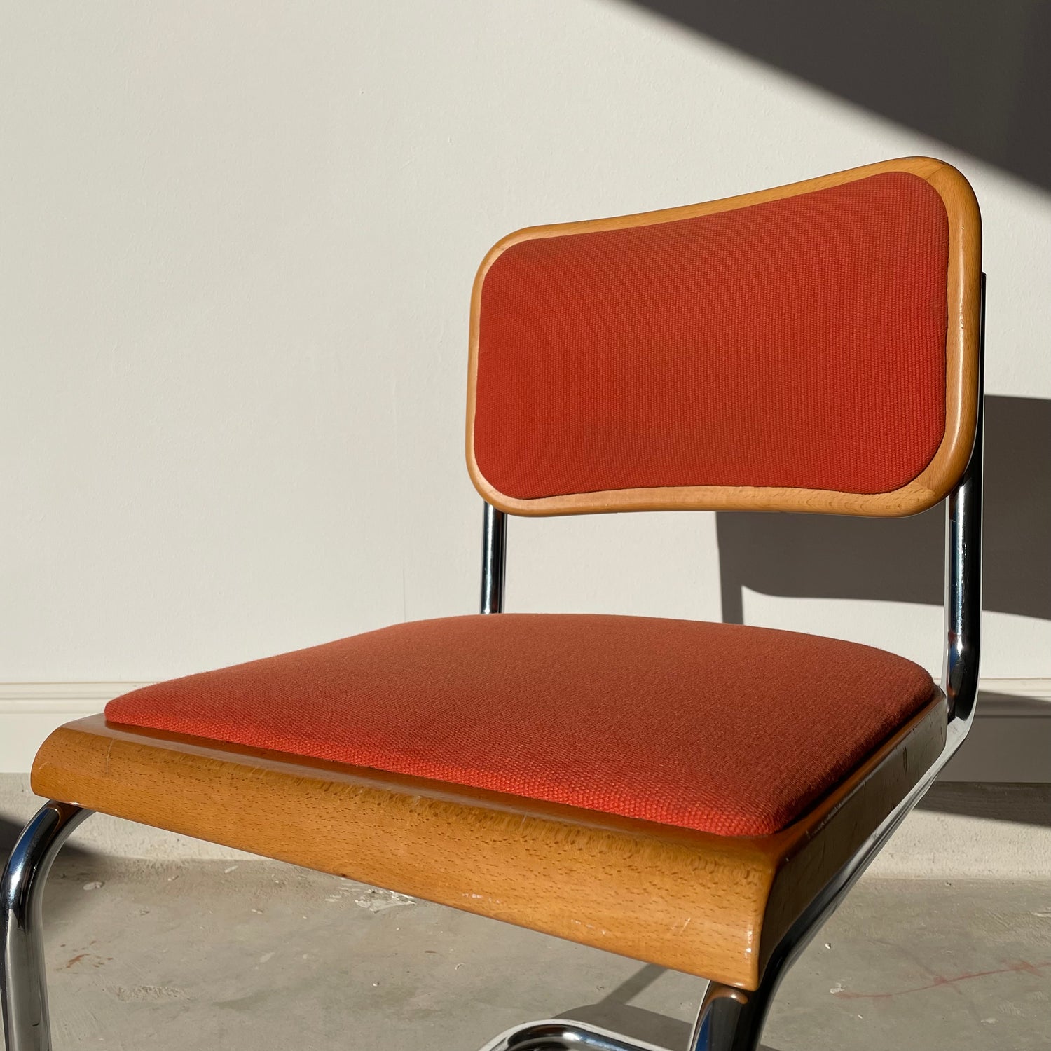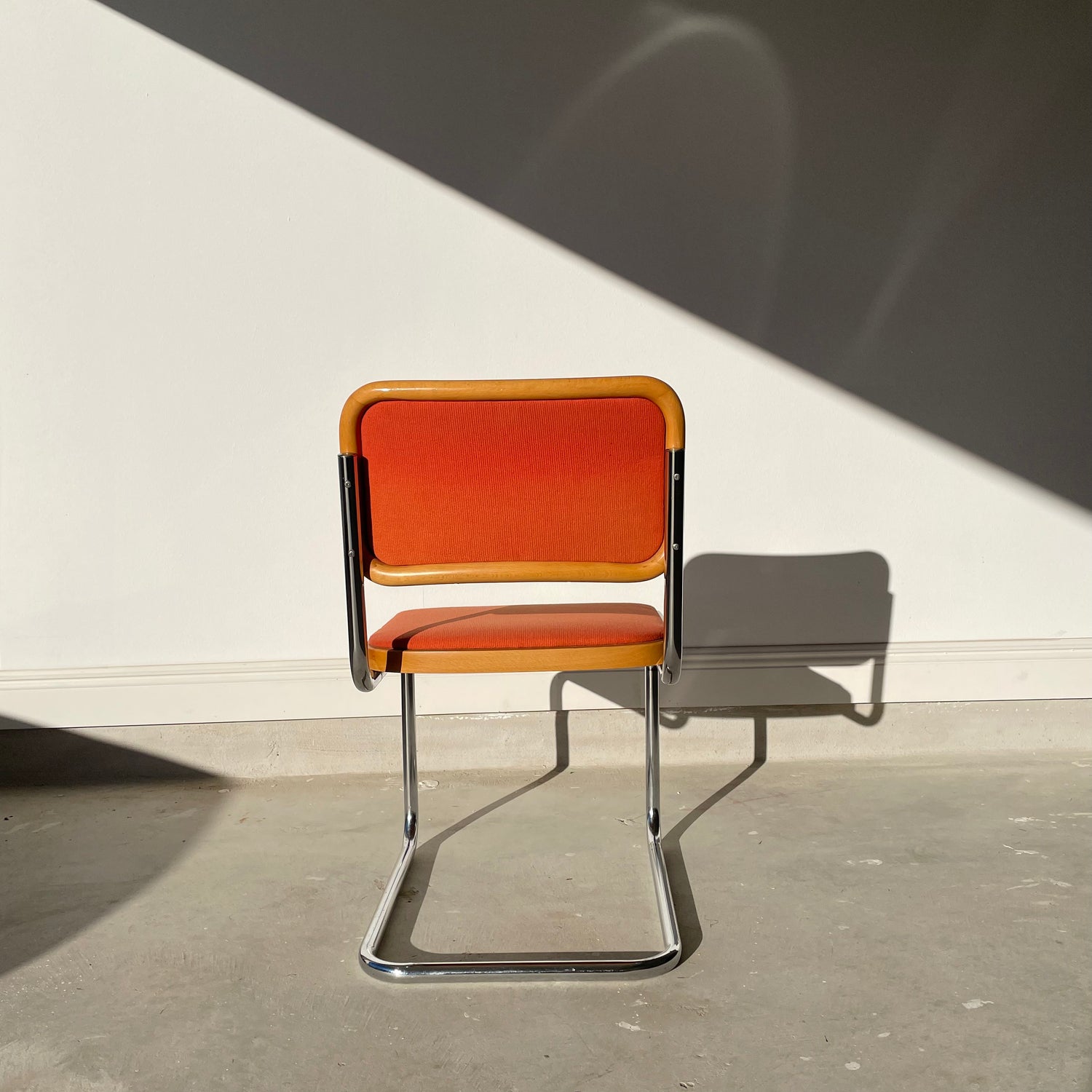 Replica of Mid-Century modern Marcel Breur Cesca Chair. Made from a singular piece of bent tubular chrome plated steel. Simple wood seat and back. Original upholstery in burnt orange; no stains.