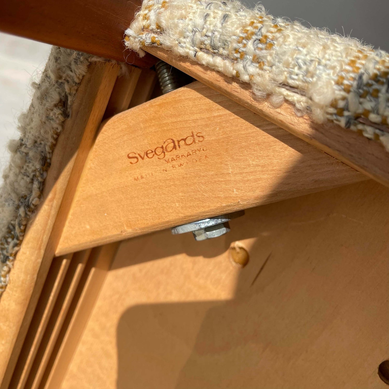 The seating was previously upholstered in vintage upholstery. The fabric is boucle with natural loop textures with a neutral plaid pattern. It does have one a small stain-- can you find it? It is not necessary to reupholster in my opinion.