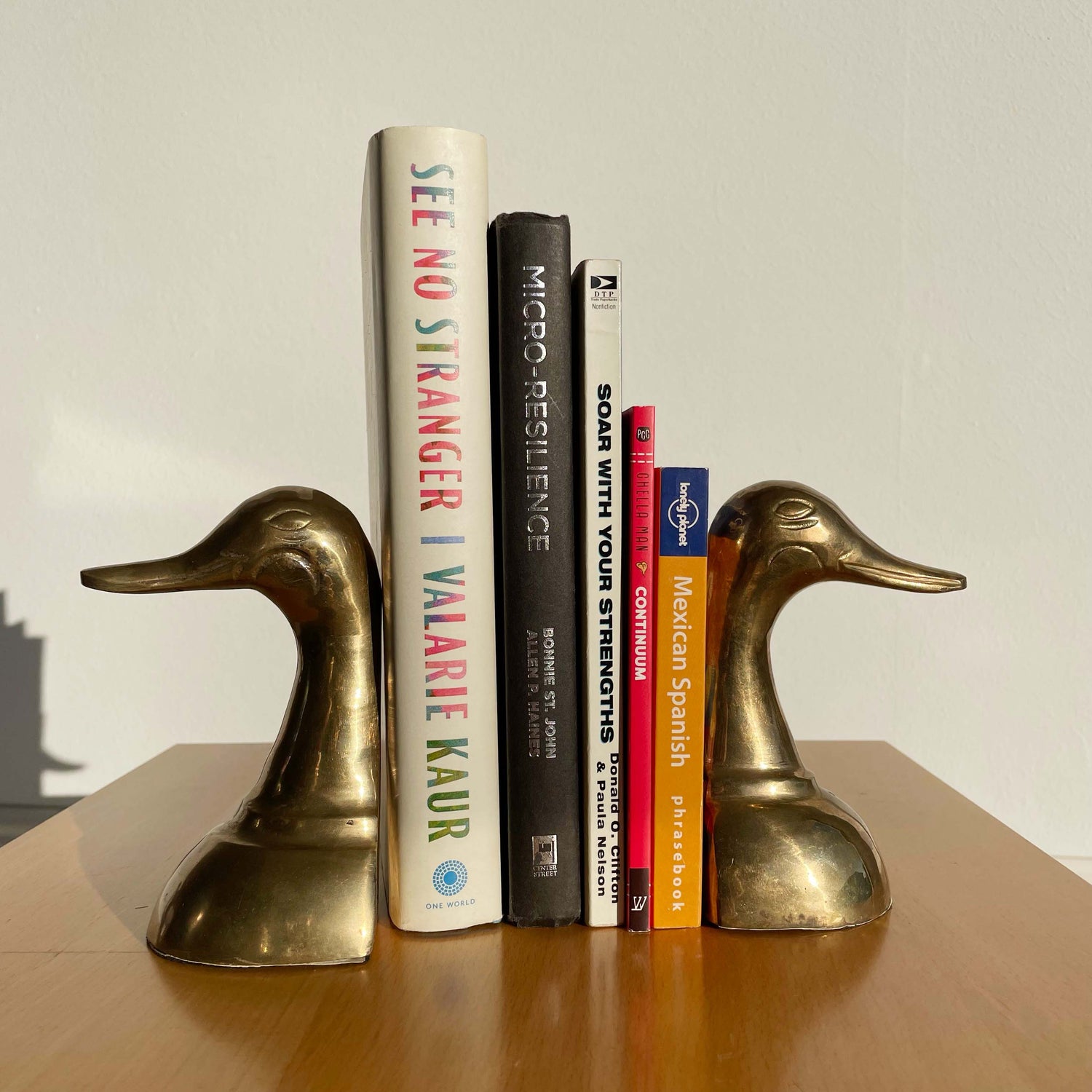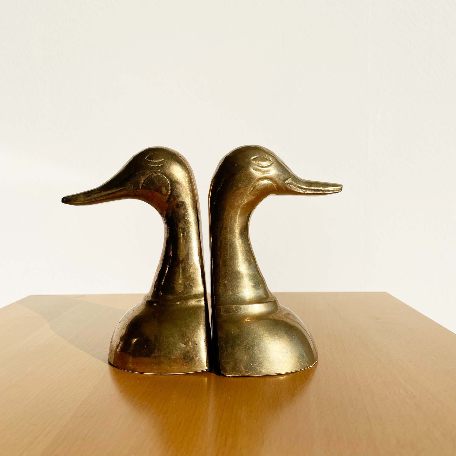 Pair of solid brass duck book ends. Features are engraved. Can be used alone as décor or as its original intended purpose. Polished and in excellent vintage condition.