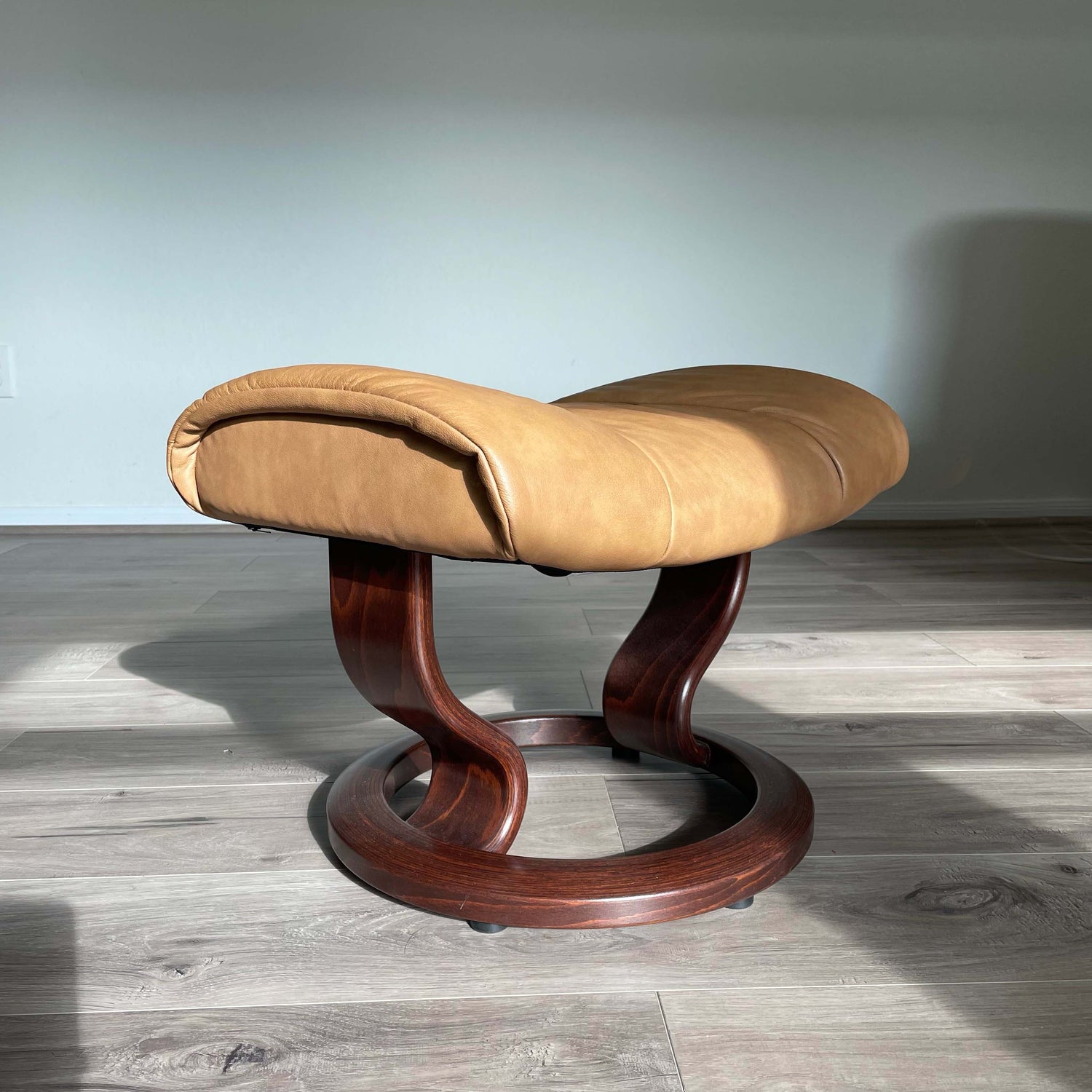 Ekornes is a luxury brand from Scandinavia. The Glide System for this Mayfair Recliner allows you to adjust the glide setting so you can automatically shift to any seating position by simply using your body weight. No levers needed. The Stressless chairs are the epitome of comfort for recliners. Comes with matching ottoman.