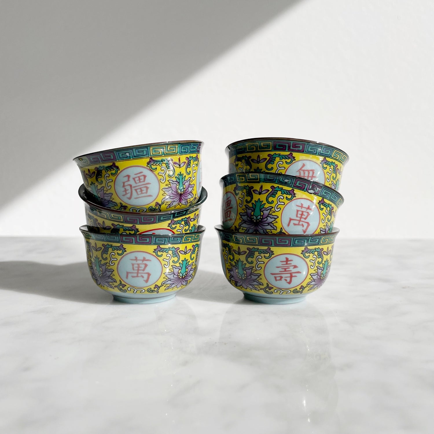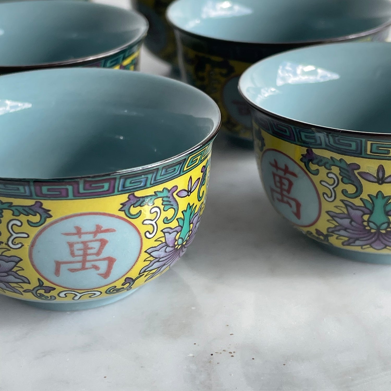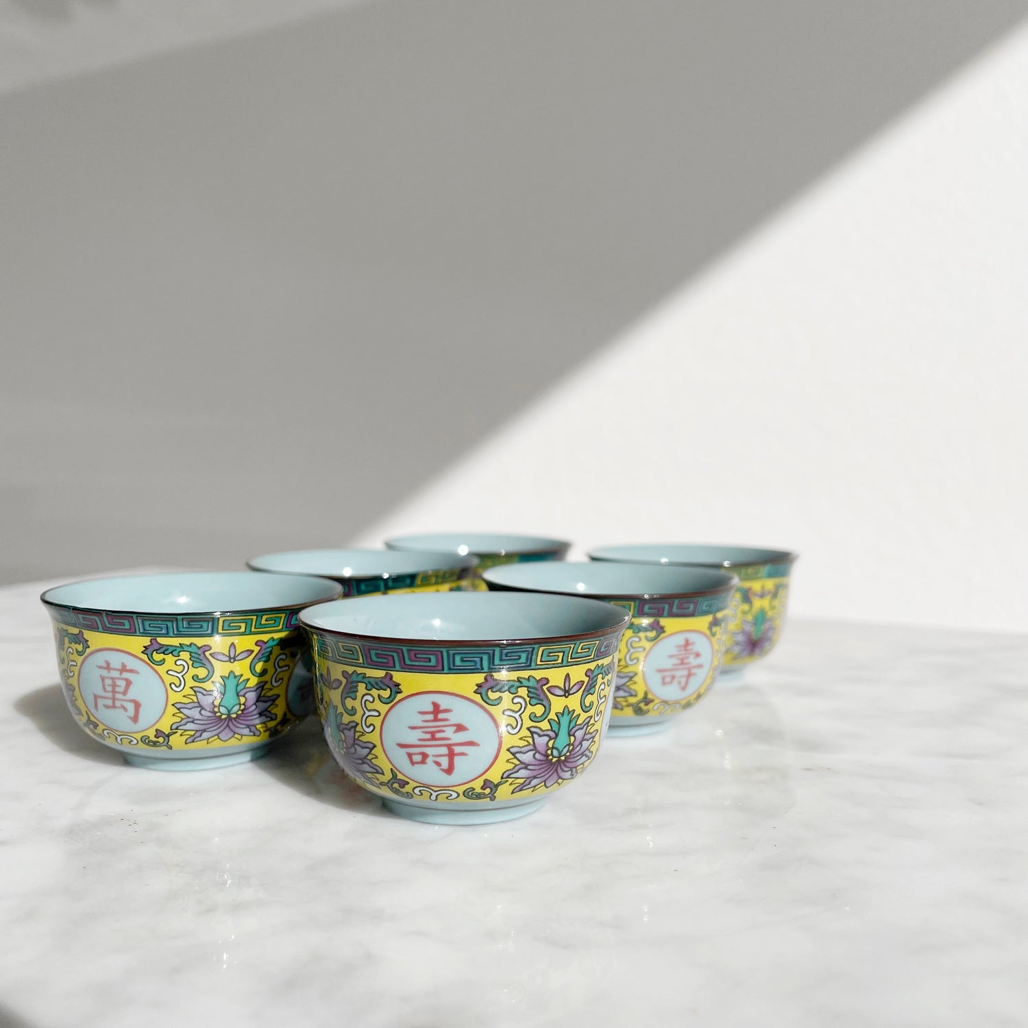 Vintage Chinese tea cups inscribed with "Wan Shou Wan Shui "(blessings for longevity) in red font on pale blue green base. Adorned with yellow ground with purple florals.