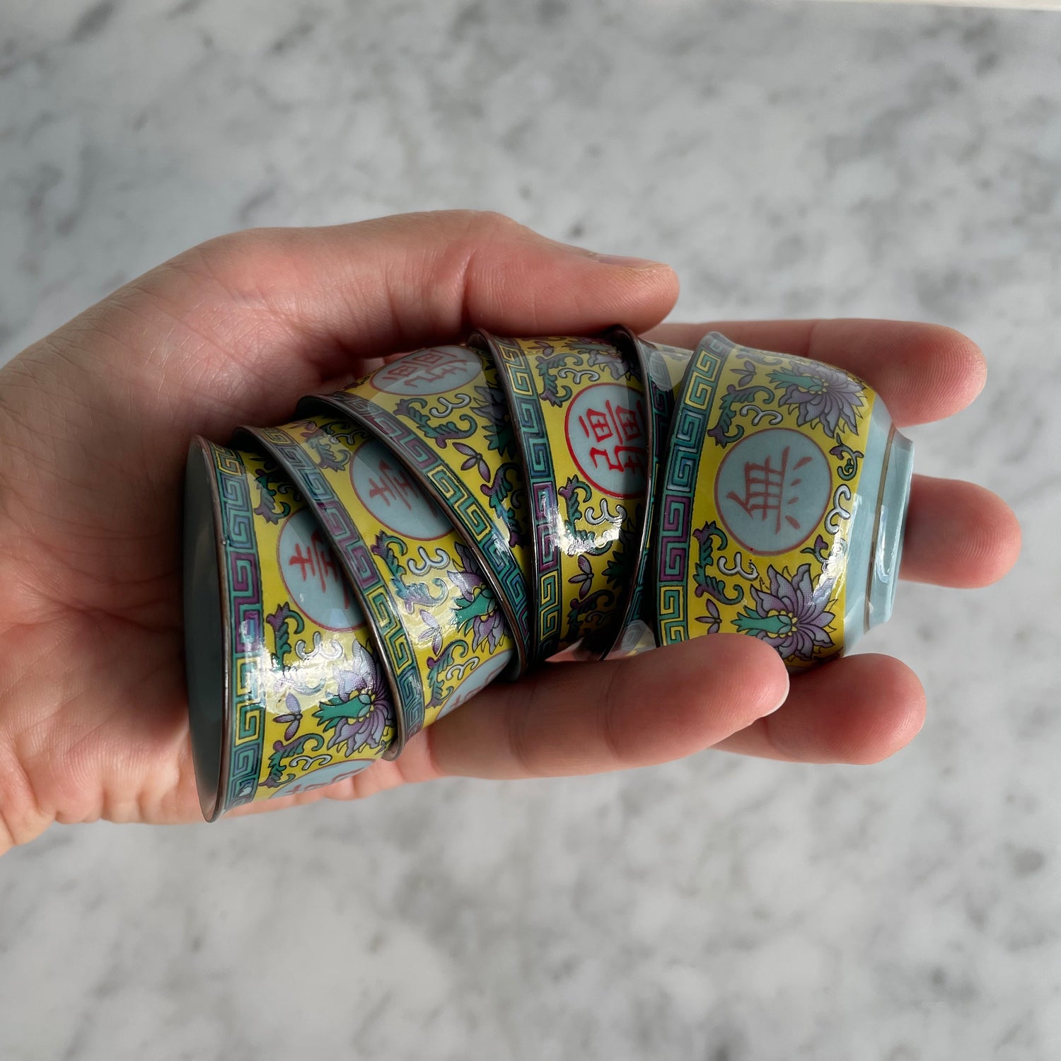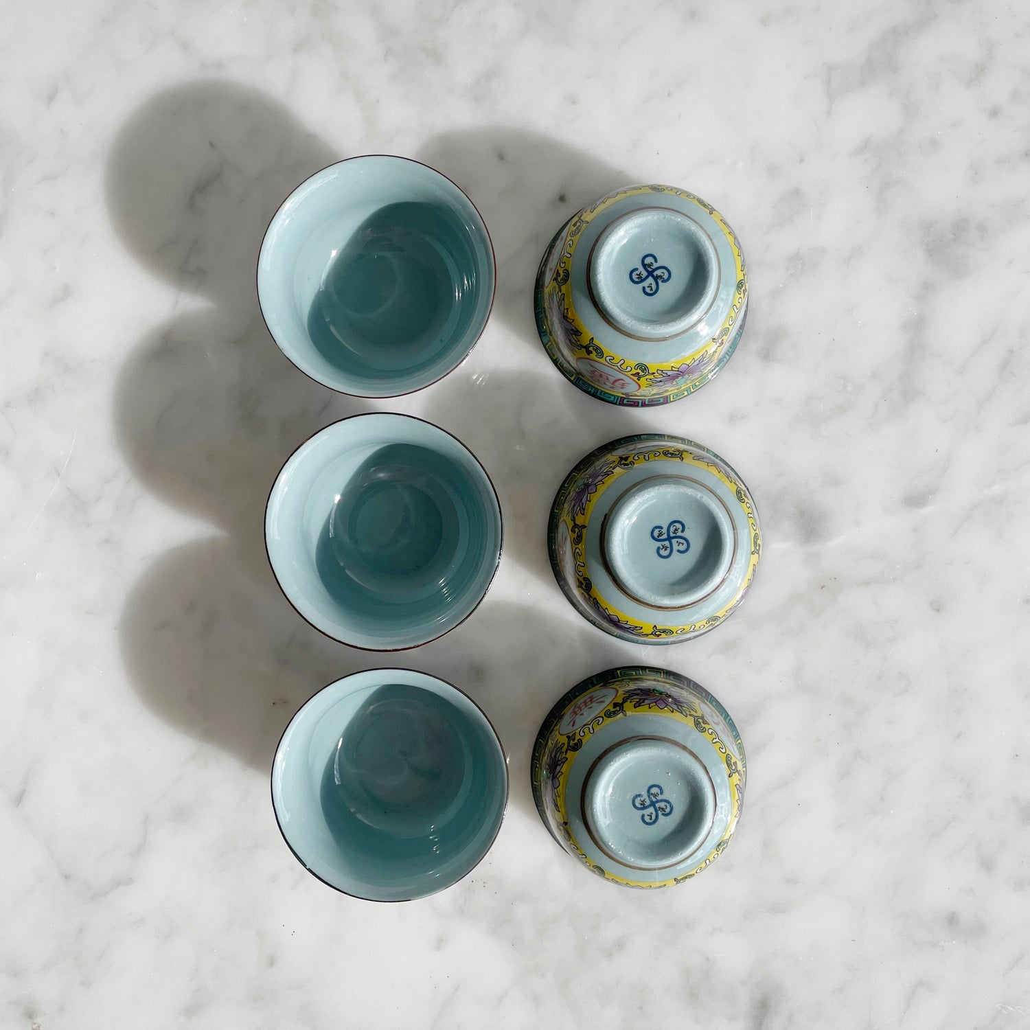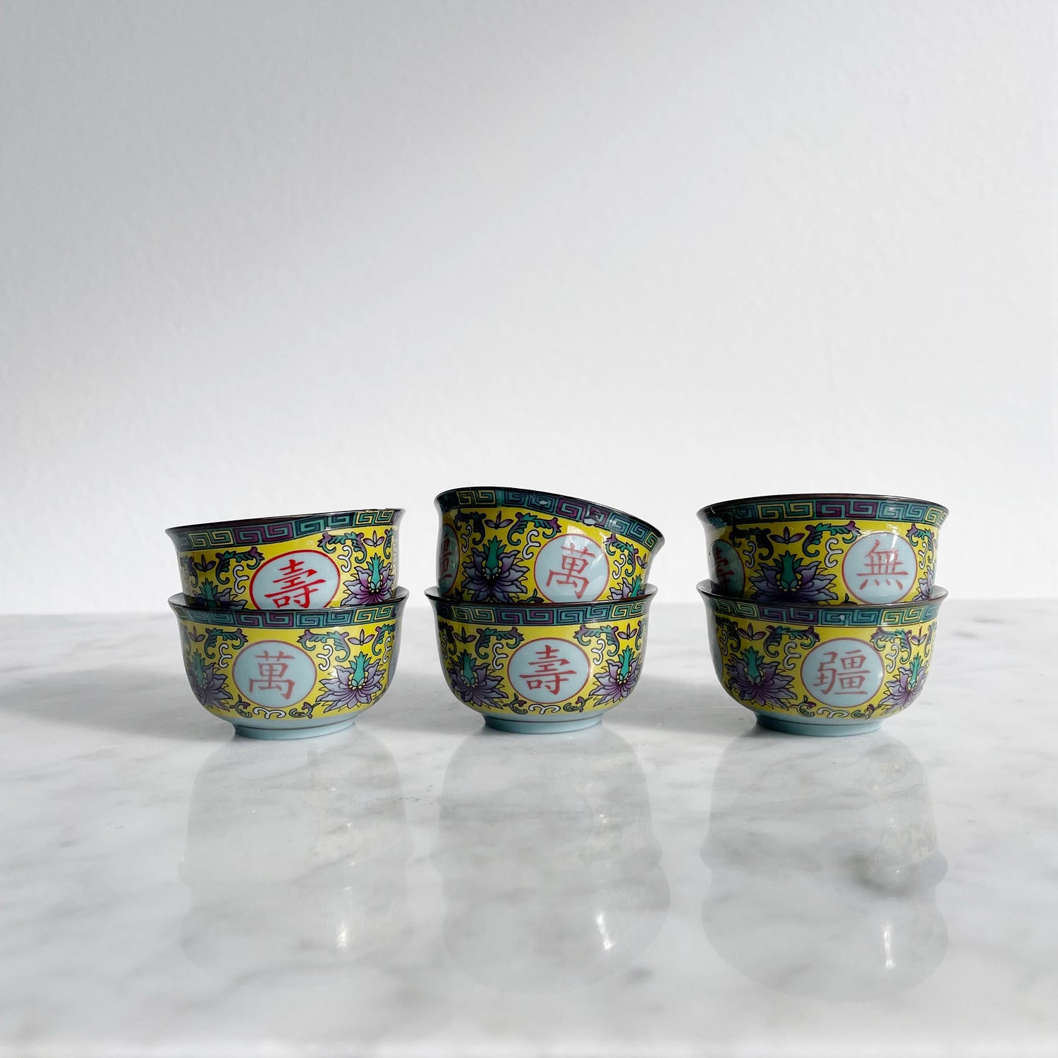 Vintage Chinese tea cups inscribed with "Wan Shou Wan Shui "(blessings for longevity) in red font on pale blue green base. Adorned with yellow ground with purple florals.