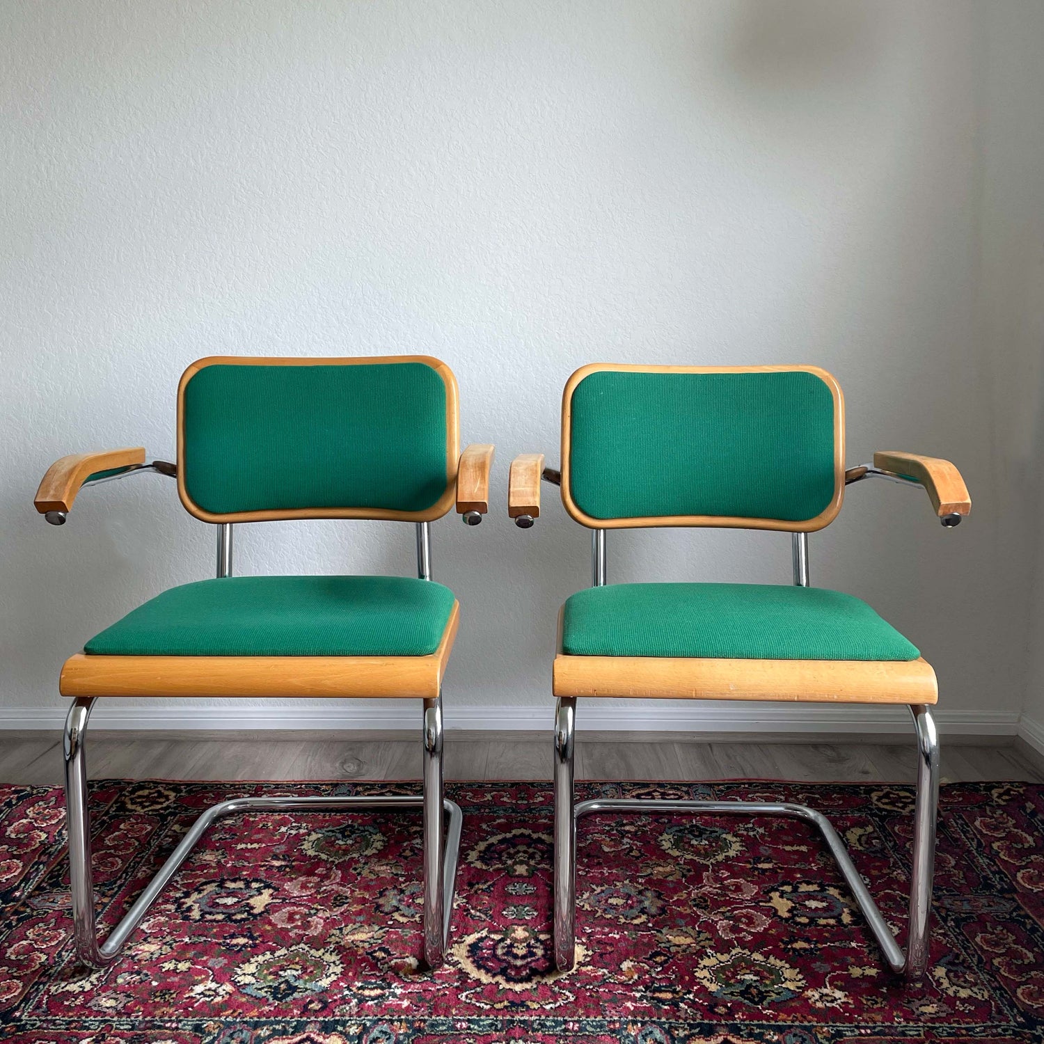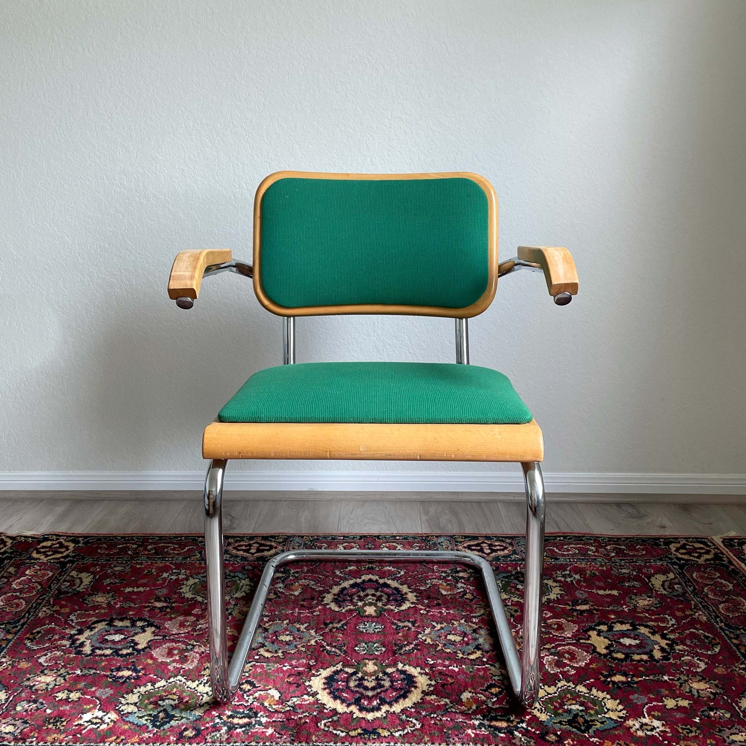 Two available. Mid century modern armchairs in Cesca Breuer style. Made from a singular piece of bent tubular chrome plated steel. Original upholstery, small linear pick of thread on both back seats. Both are sturdy, well built. Wood finish consistent to age.