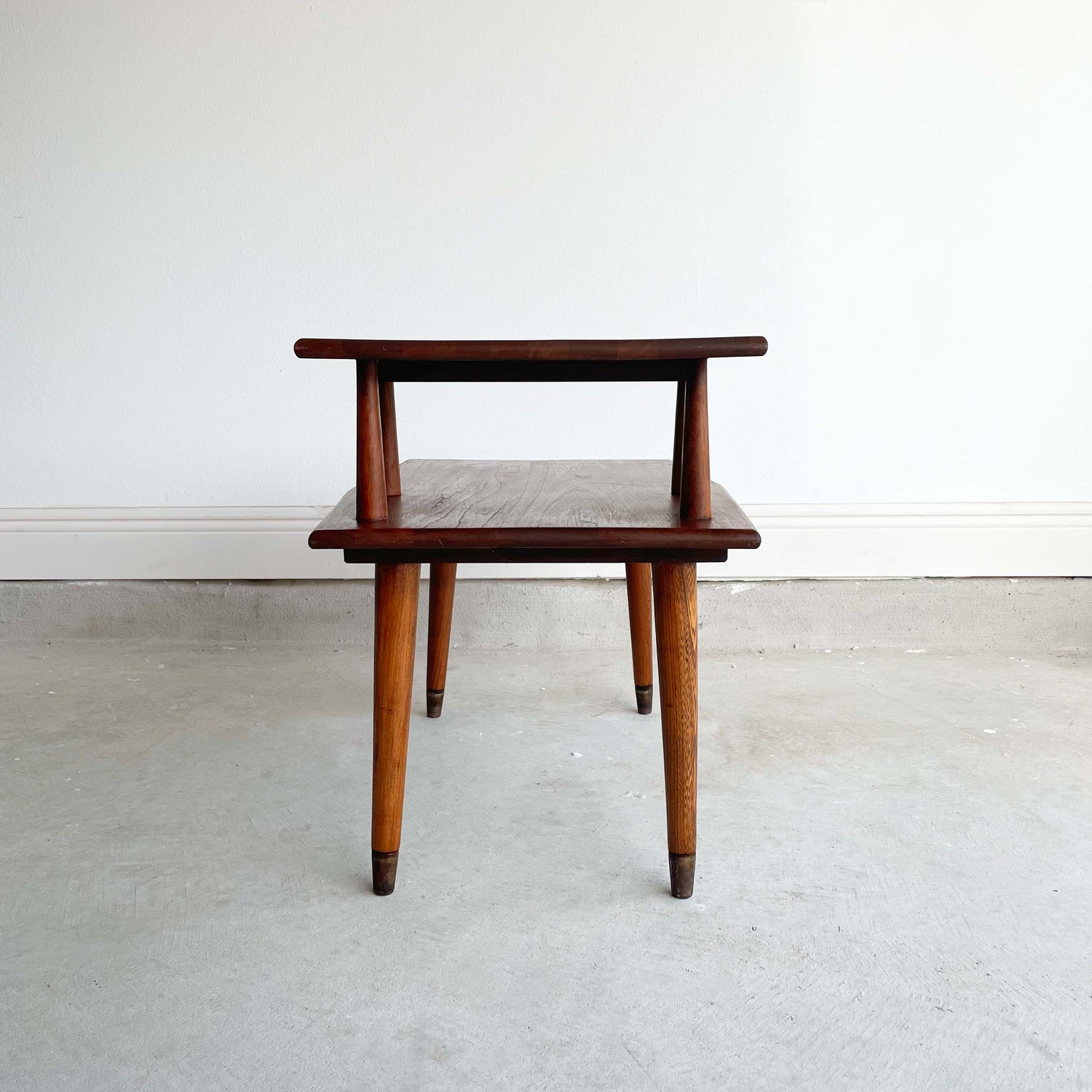 Excellent condition MCM Vintage two tier end table. Unique shape. It is not a plain straight cut rectangle, this is a special hexagon. The grain from the wood & color is beautiful. Barely any imperfections. Any flaws are so minor you have to get super close to see. Enjoy in your living room or bedside table.