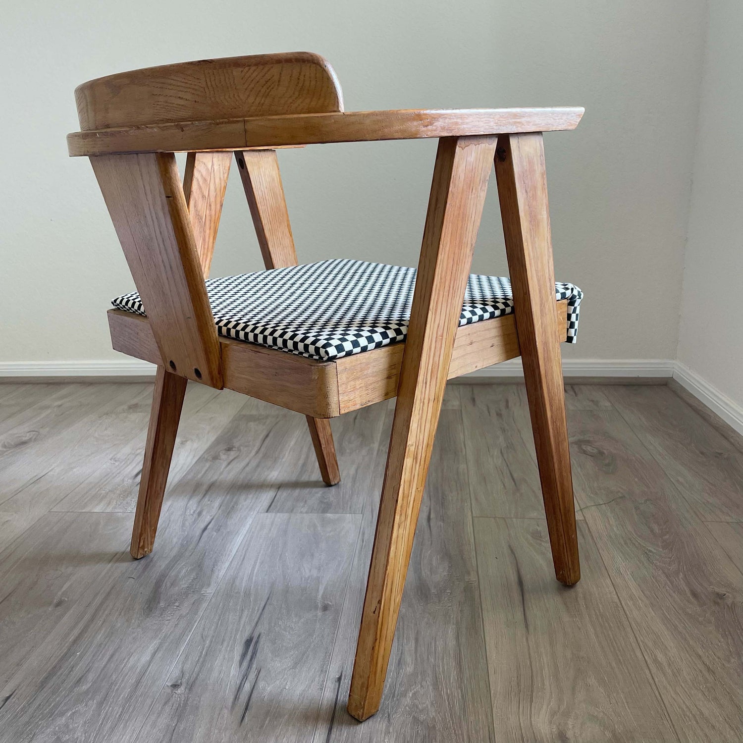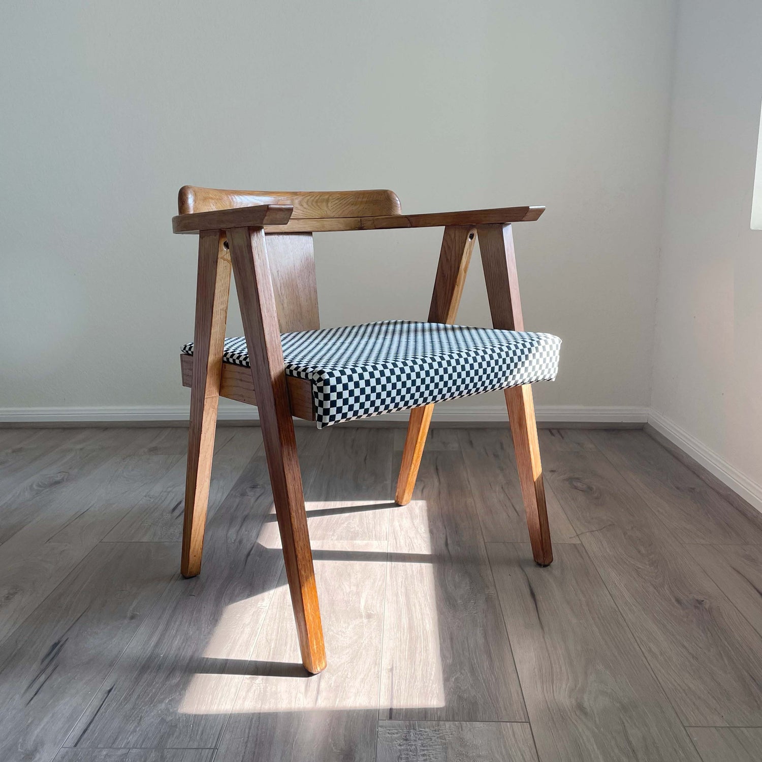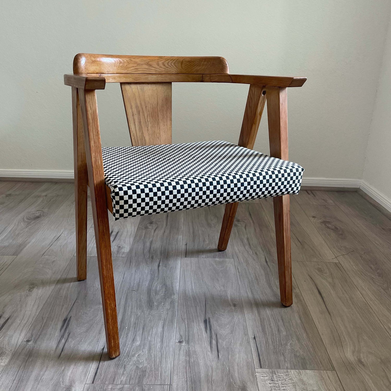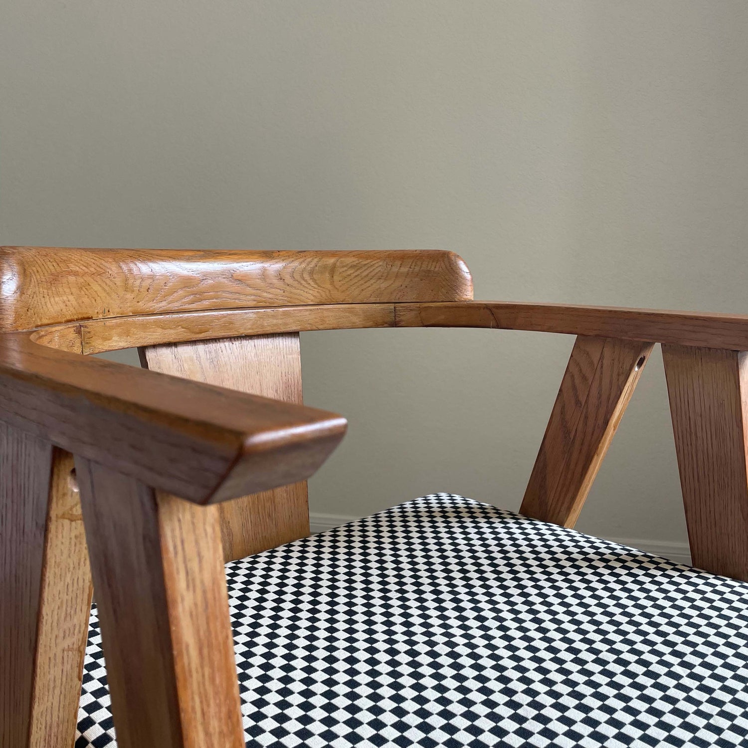 Newly upholstered with black & white checkerboard, the same upholstery used in the Eames Lounge Chair. Previously stained; newly polished.