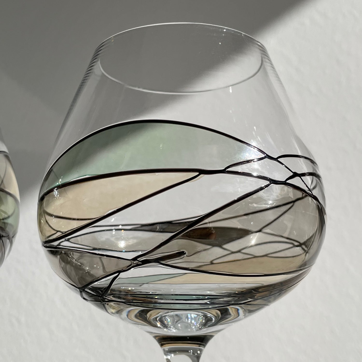 Each glass is hand decorated with no two identical pattern. Fluid, hand painted mosaic patterns that create a bold, linear stained glass look. Rich colors of sea green, soft yellow, tawny brown and reflective silver outlined in a thin, wispy iron black line crisscrossing in an organic flow.