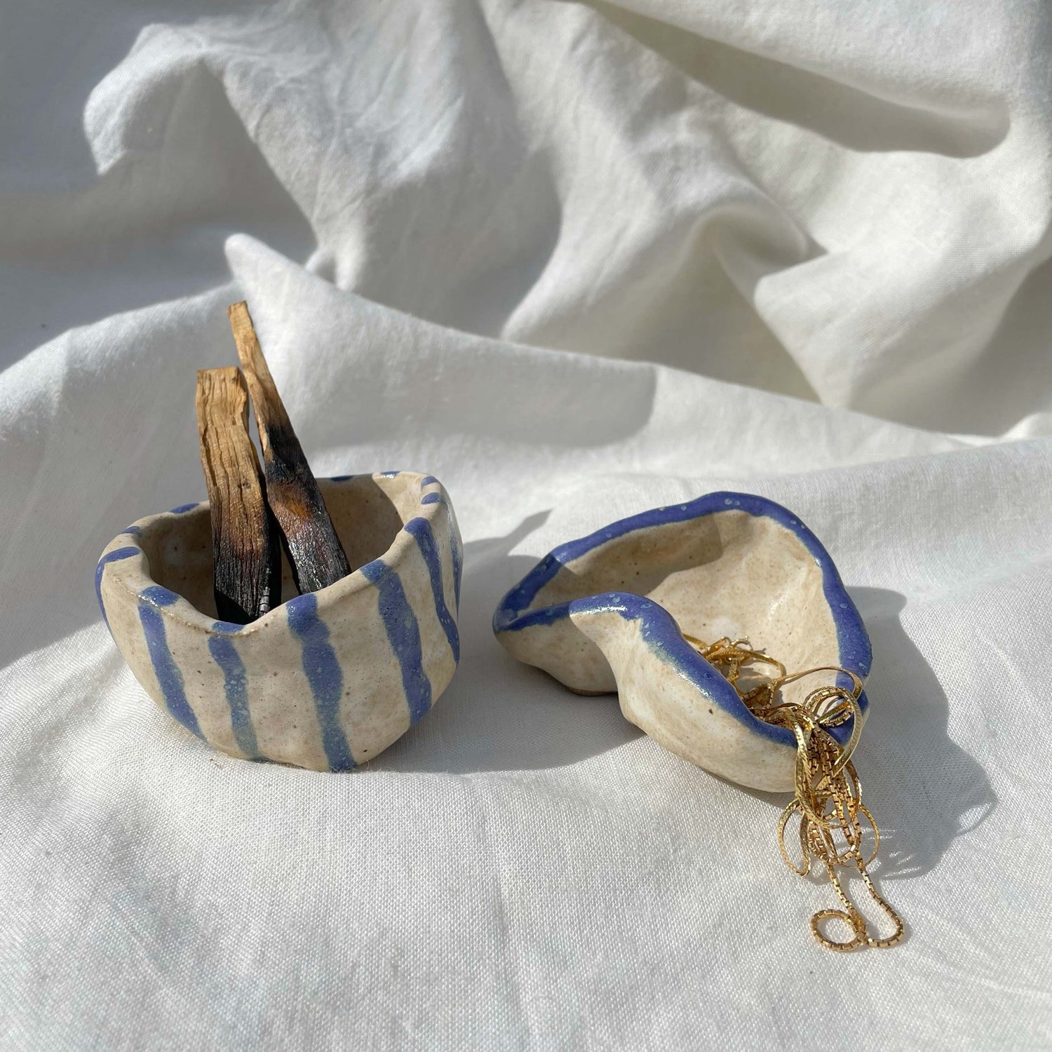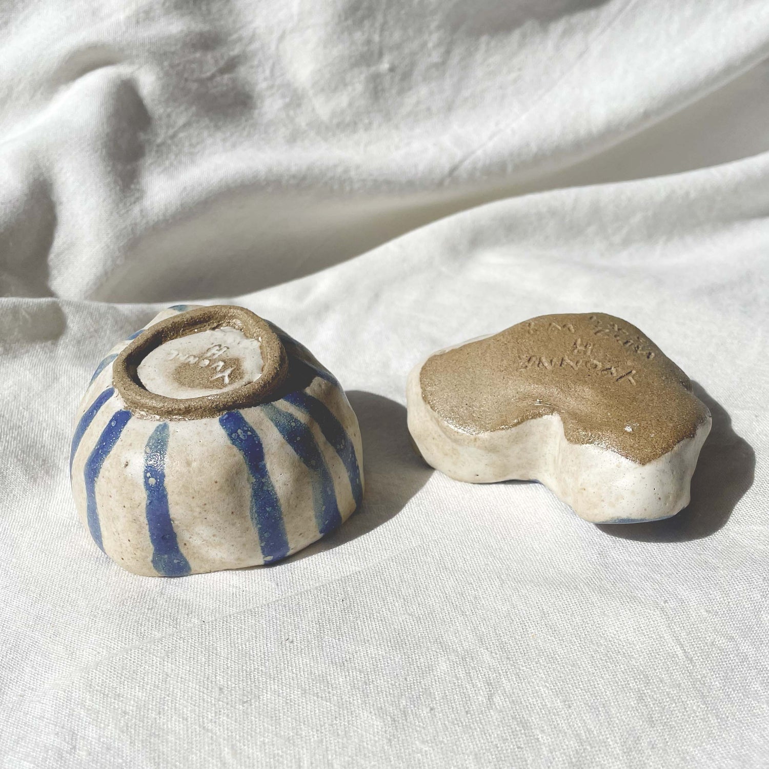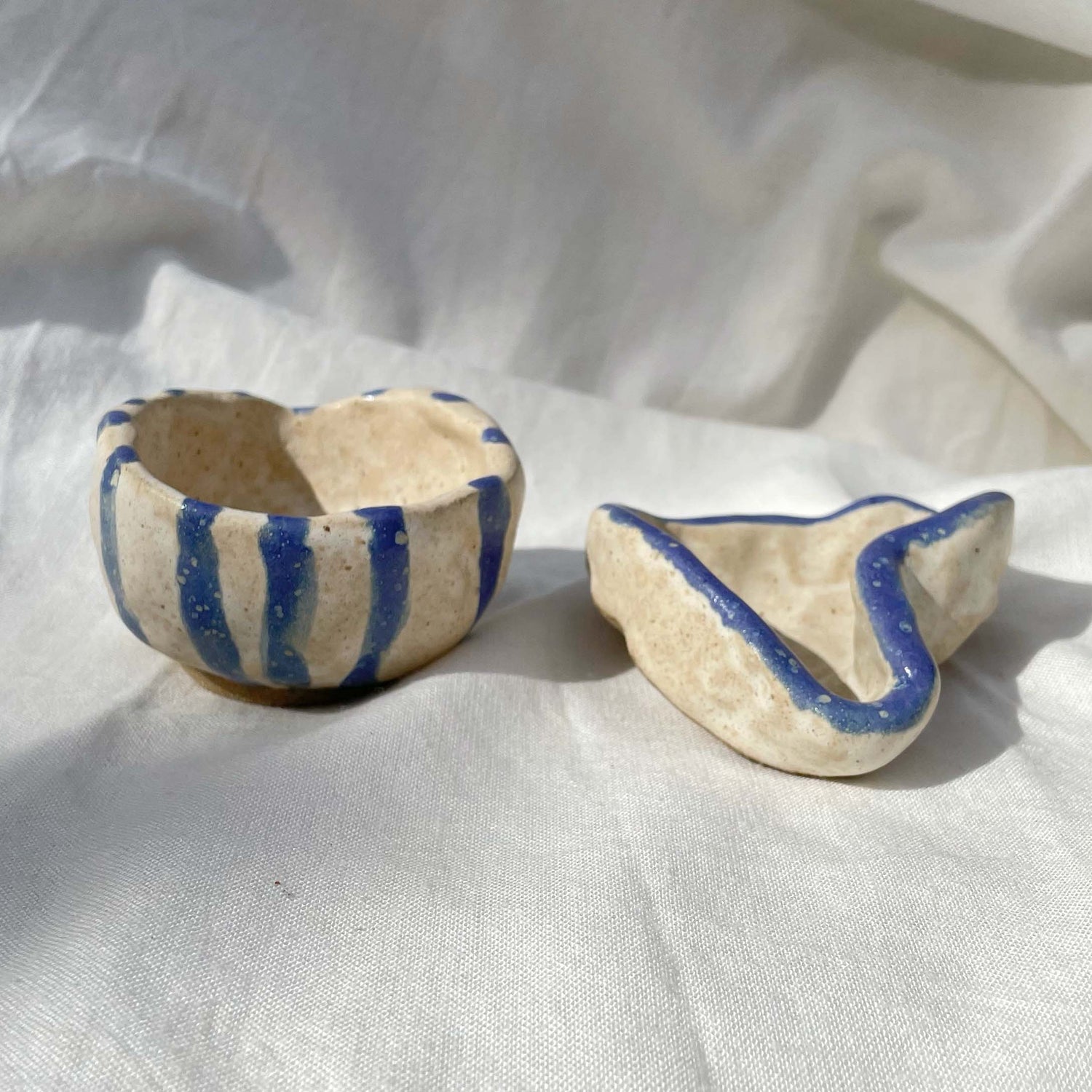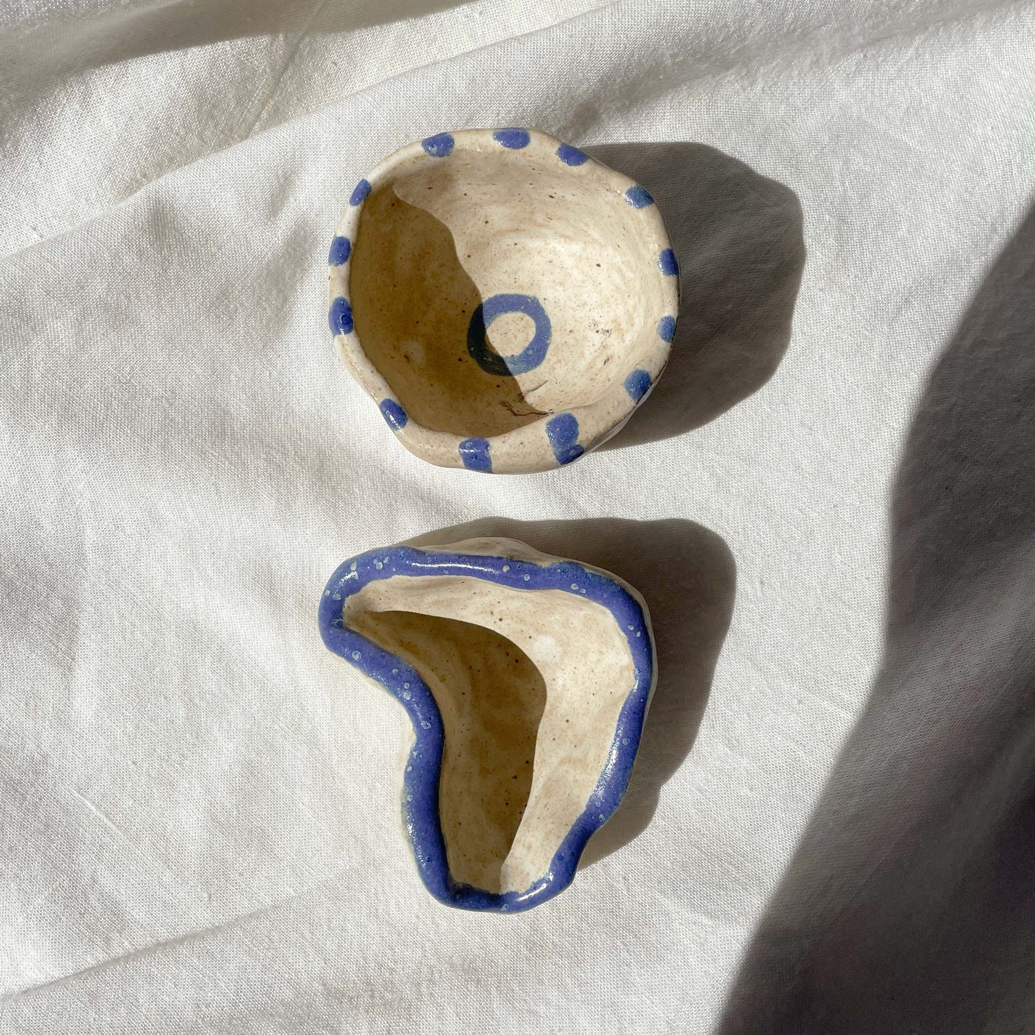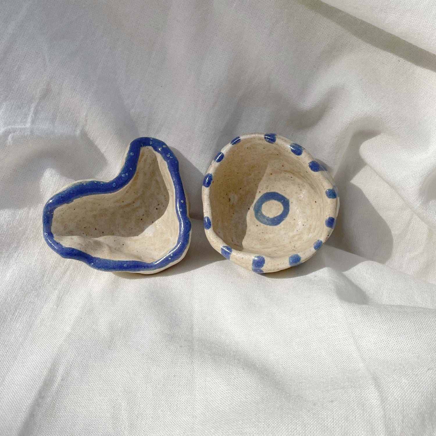 Pinched to fit in palm of your hands. Hand painted, coiled trinket bowls.