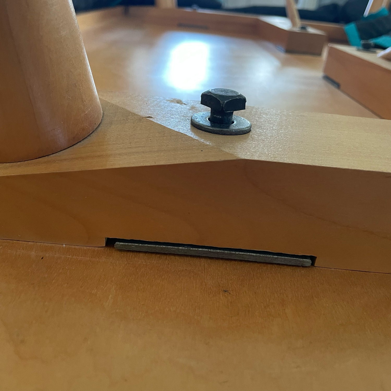Top: Sleek maple design with a rectangular top. Check out the corner joinery. Plenty of leg room. There is an additional clearance under the lip of table for crossing legs; see photo.