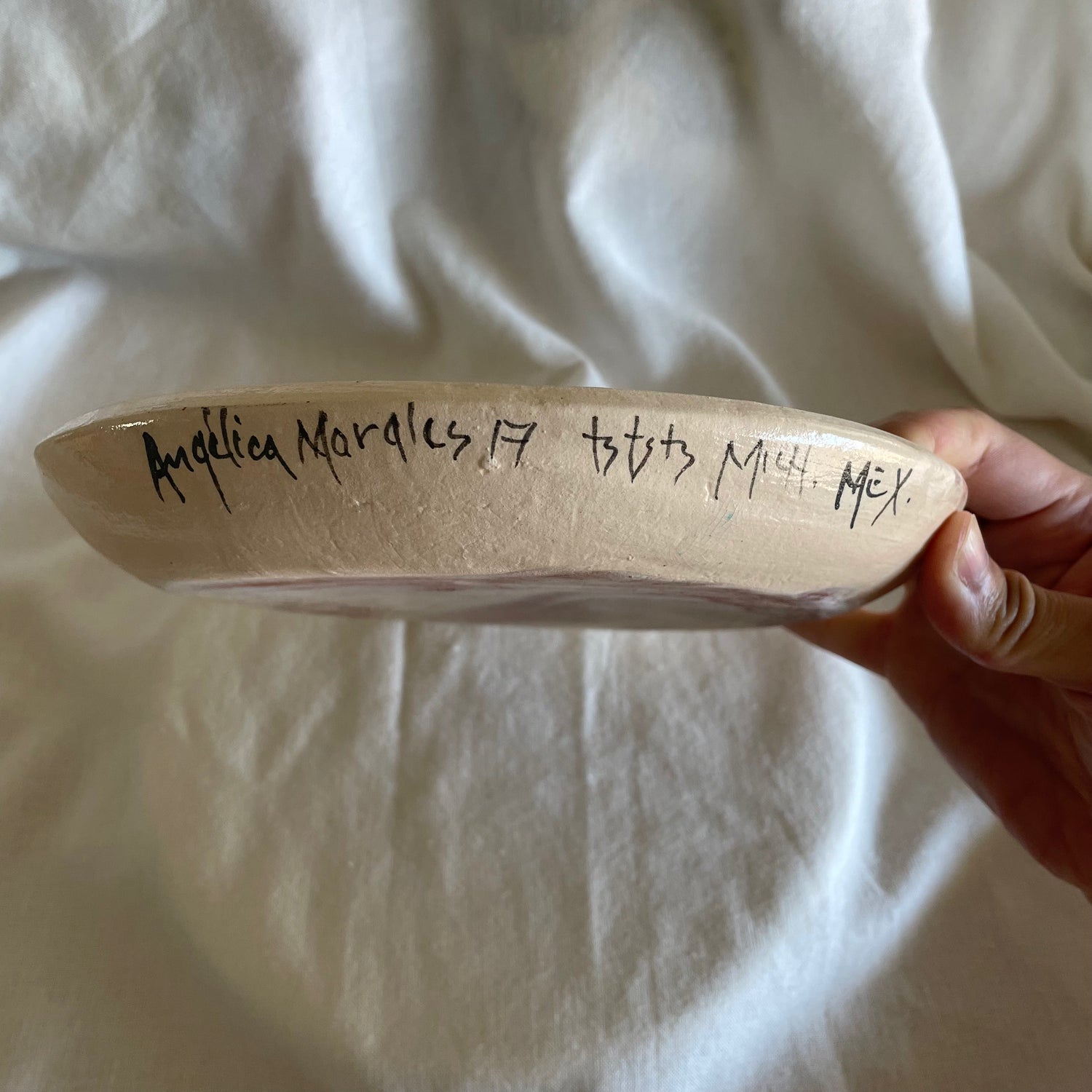 Tzintzunzan is a city in the state of Michoacan where potters use distinctive colors and designs. Morales uses manganese black over a background of kaolin white and glaze. Each of the drawings that decorate Angelica's pieces are defined as folk art.