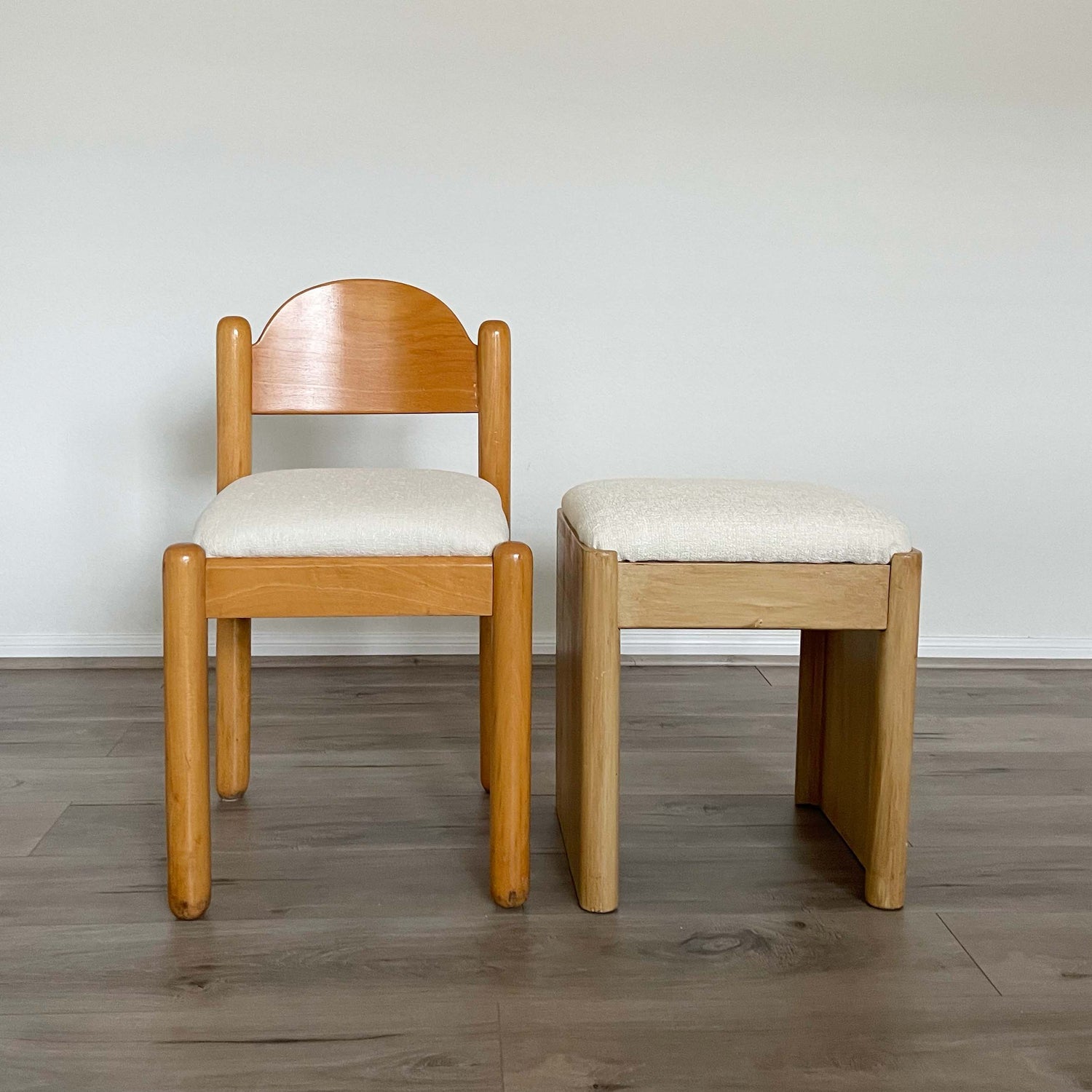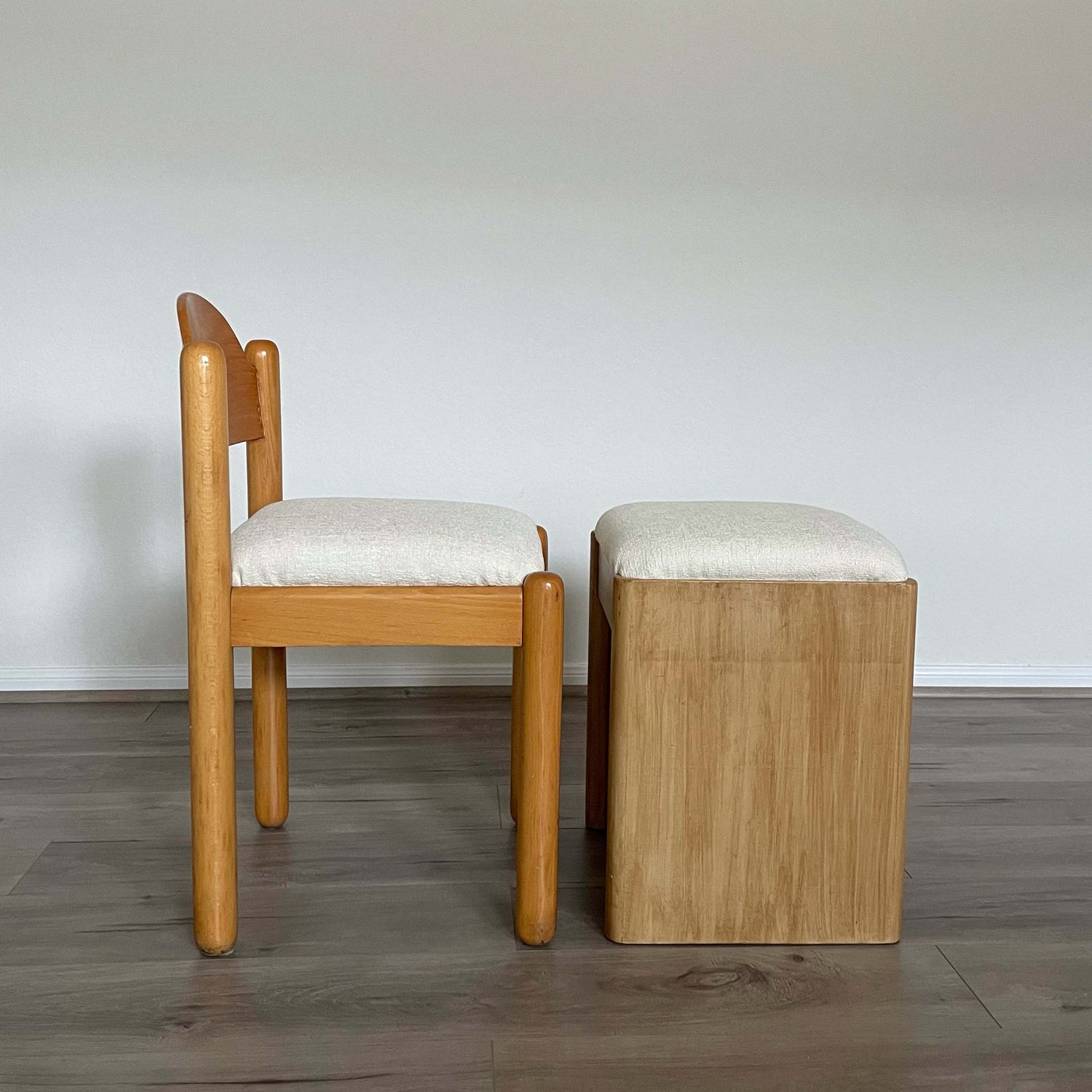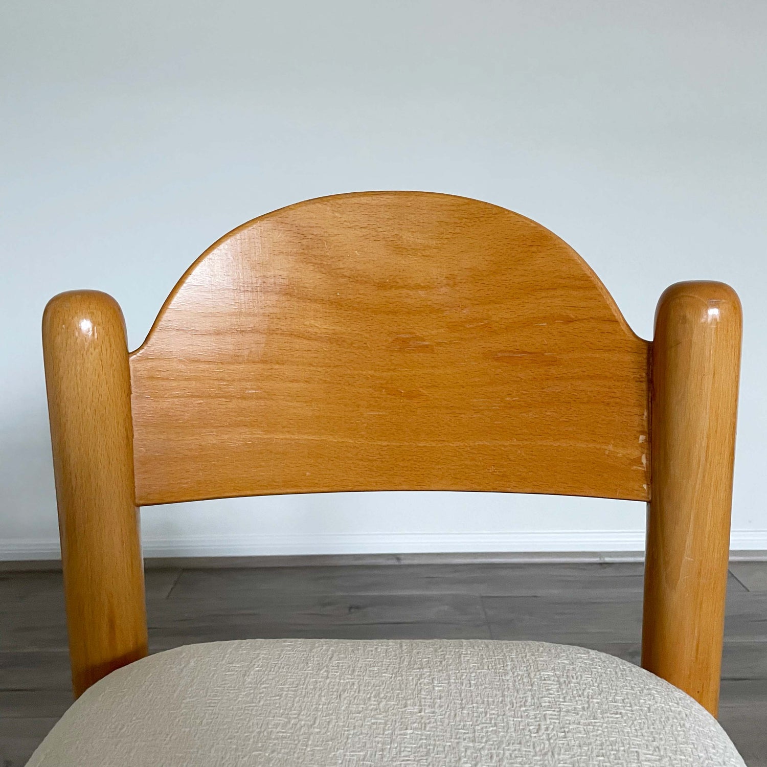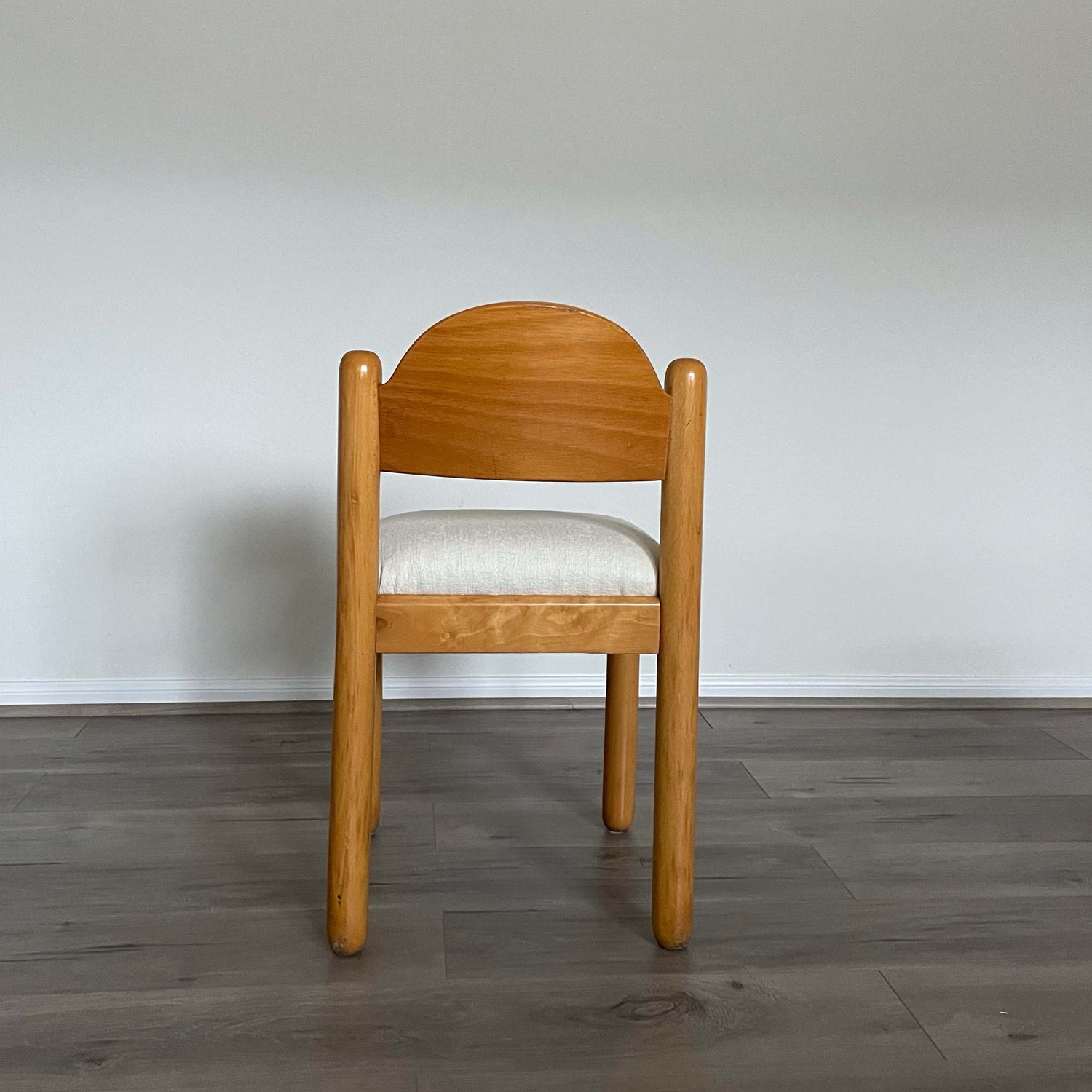 A 1970's vintage Hank Lowenstein Padova dining chair. Made in Italy. Features round authentic chubby oak legs, curved scalloped back and newly reupholstered seating + cushion.