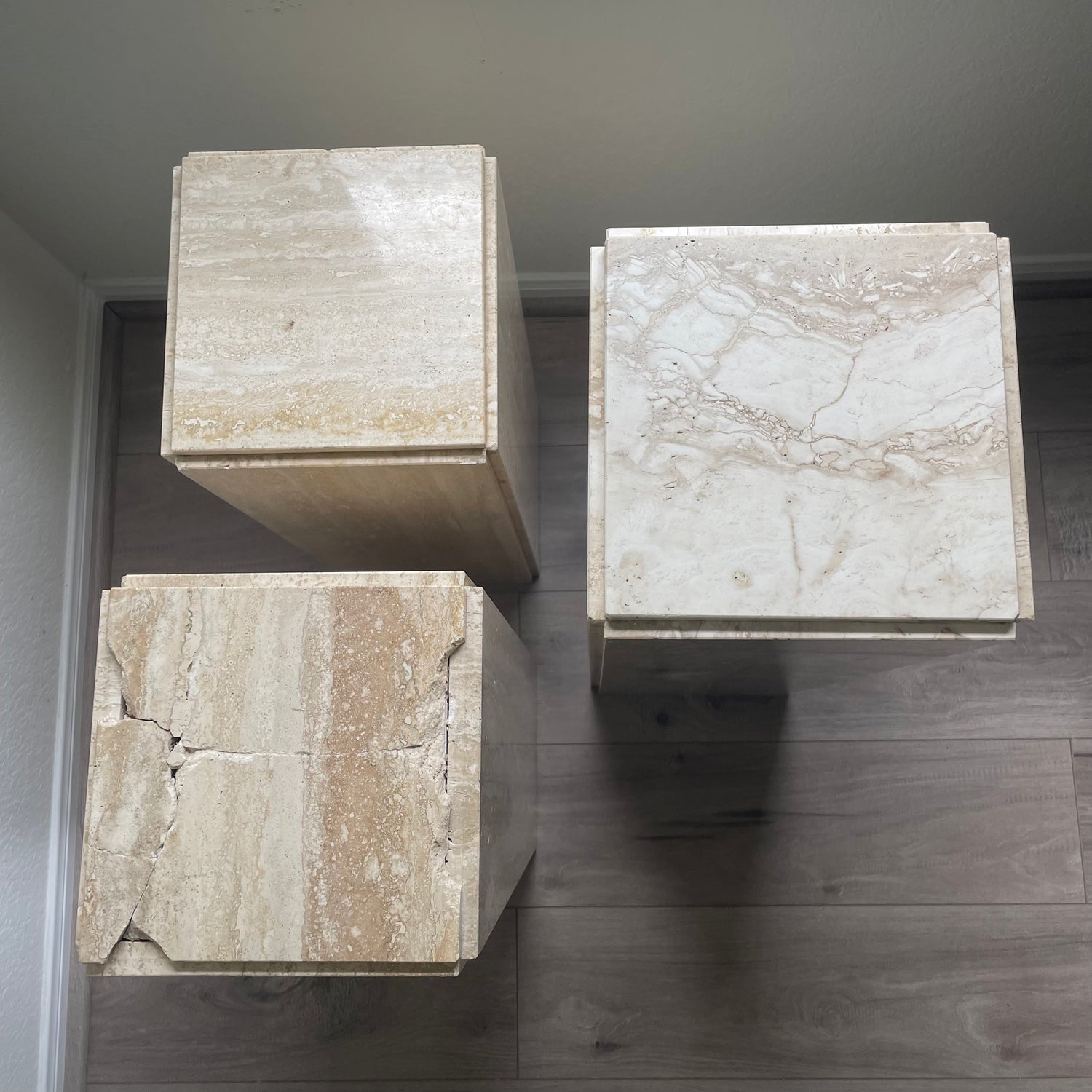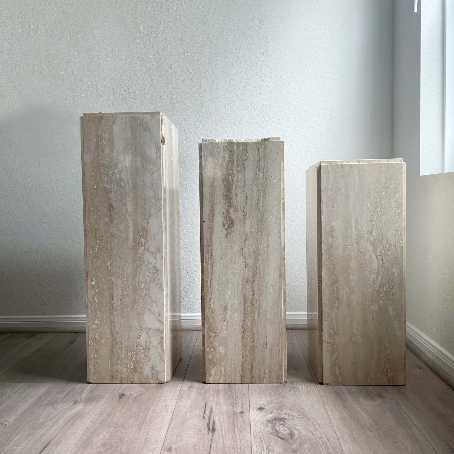 A trio of tall, medium and short travertine pedestals. Beautiful array of colors including whites, sands, buttercream and light warm brown. Matte/low shine finish and chamfered edges.