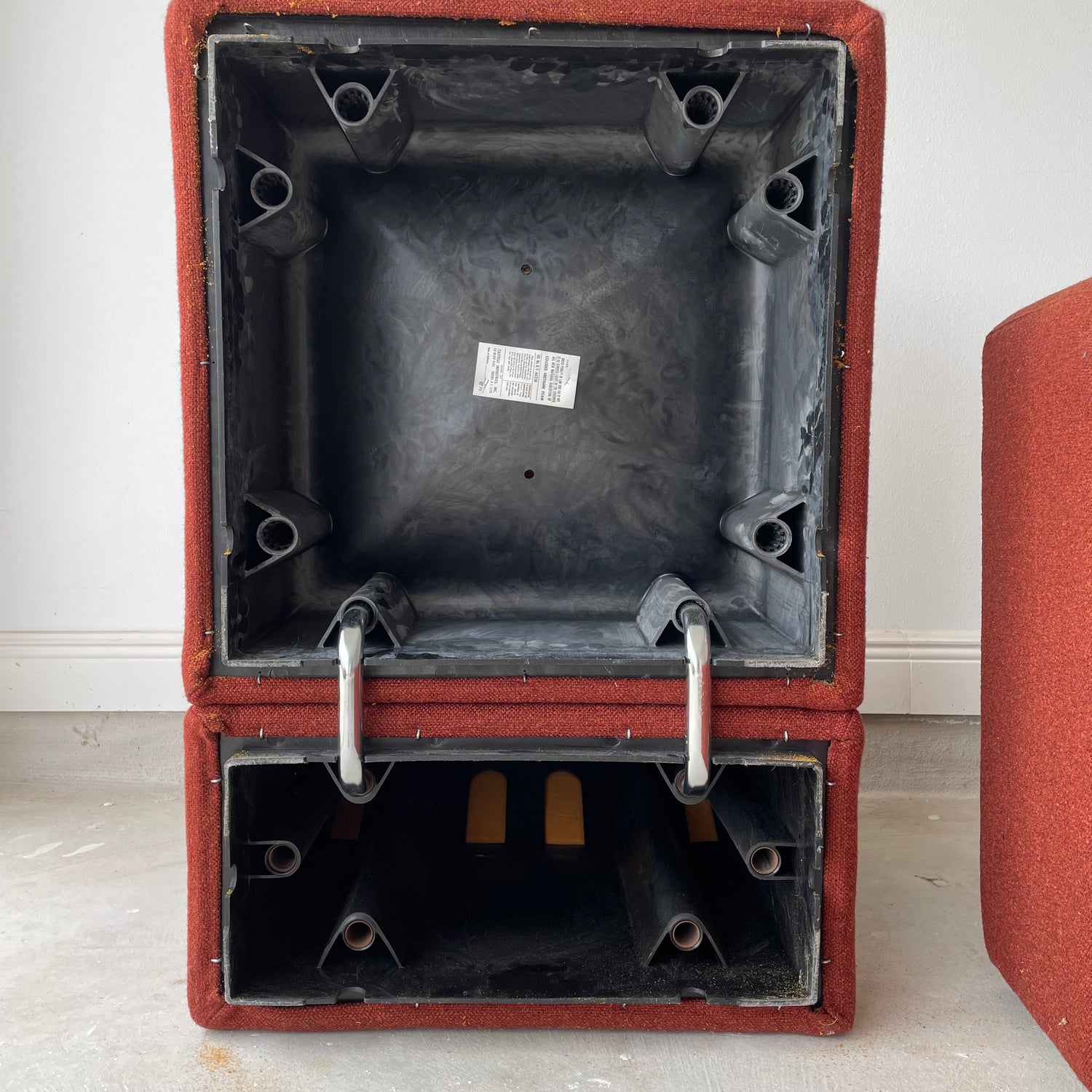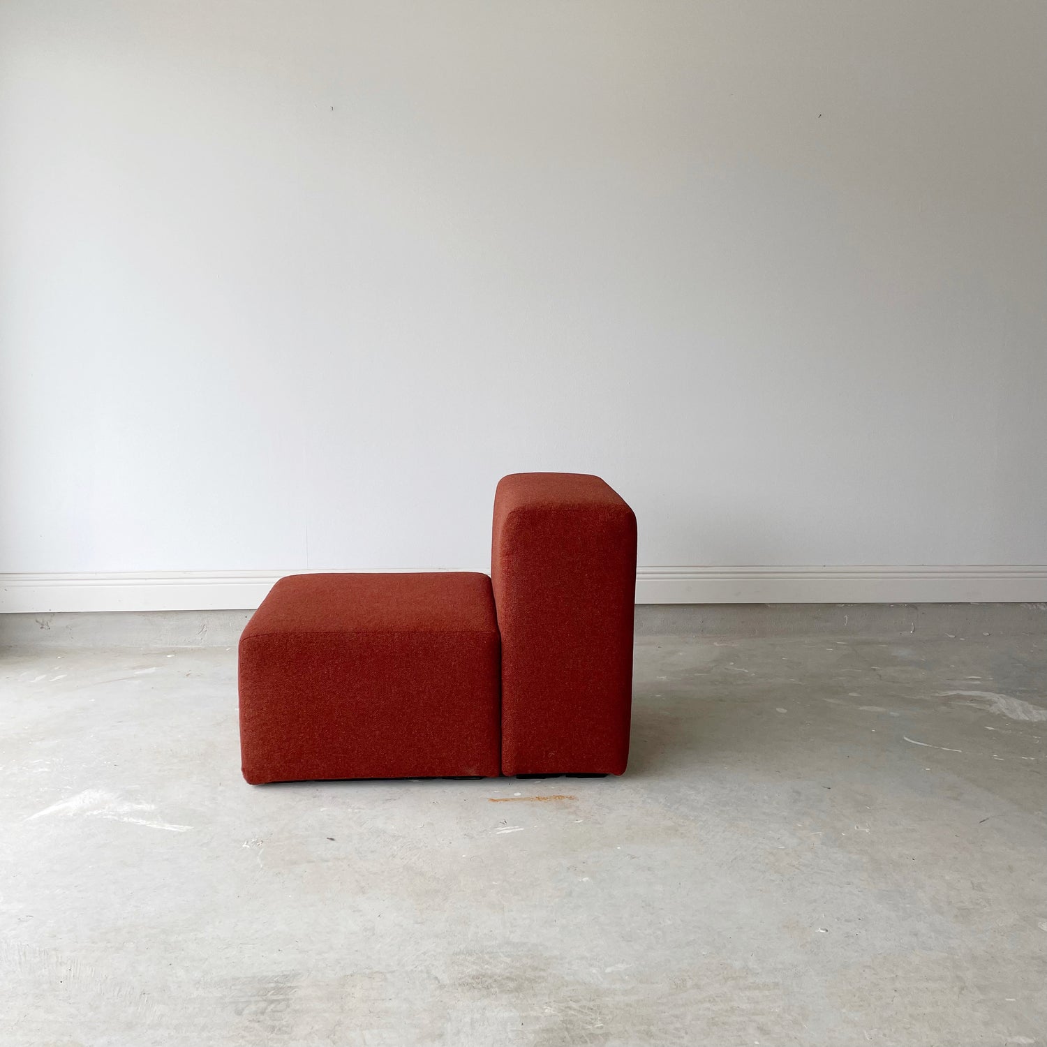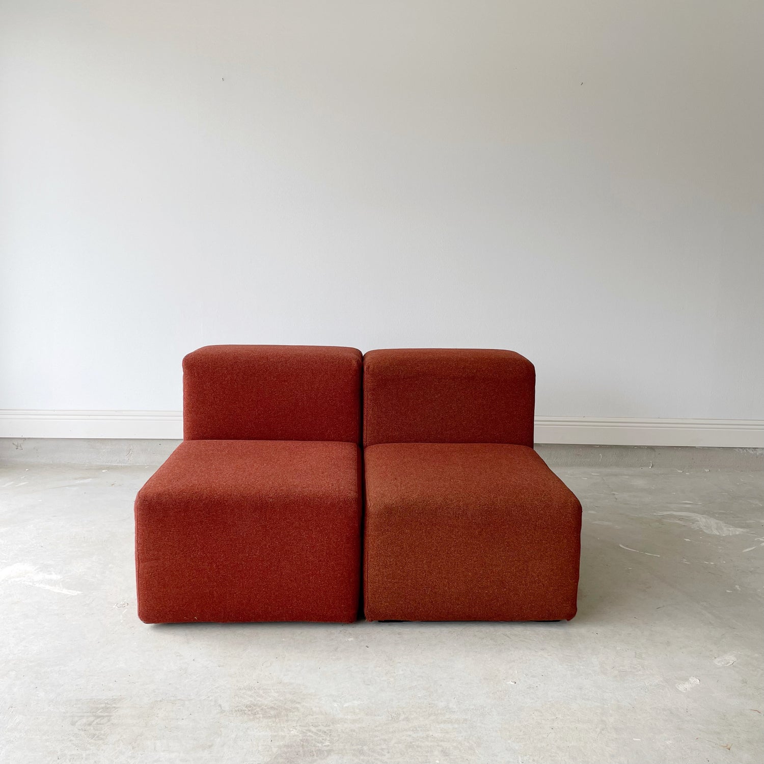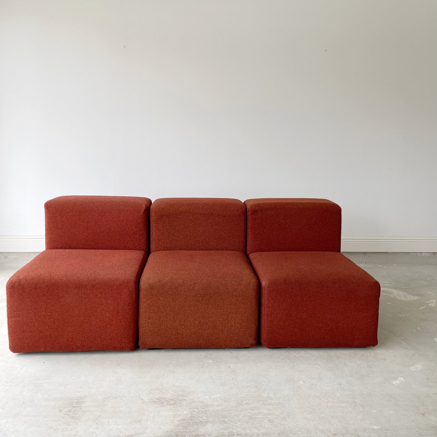 This is a modular system consisting of cubic blocks that can be configured and re-configured in different arrangements. This collection is made up of 3 seating sections, 3 backrests/arms. Each section is linked with 2 independent steel component which are not visible but allows flexibility when arranging.  Separate out as conversational pieces or place together as a 3 seater couch.