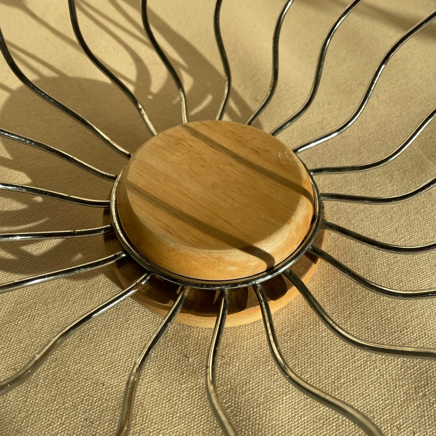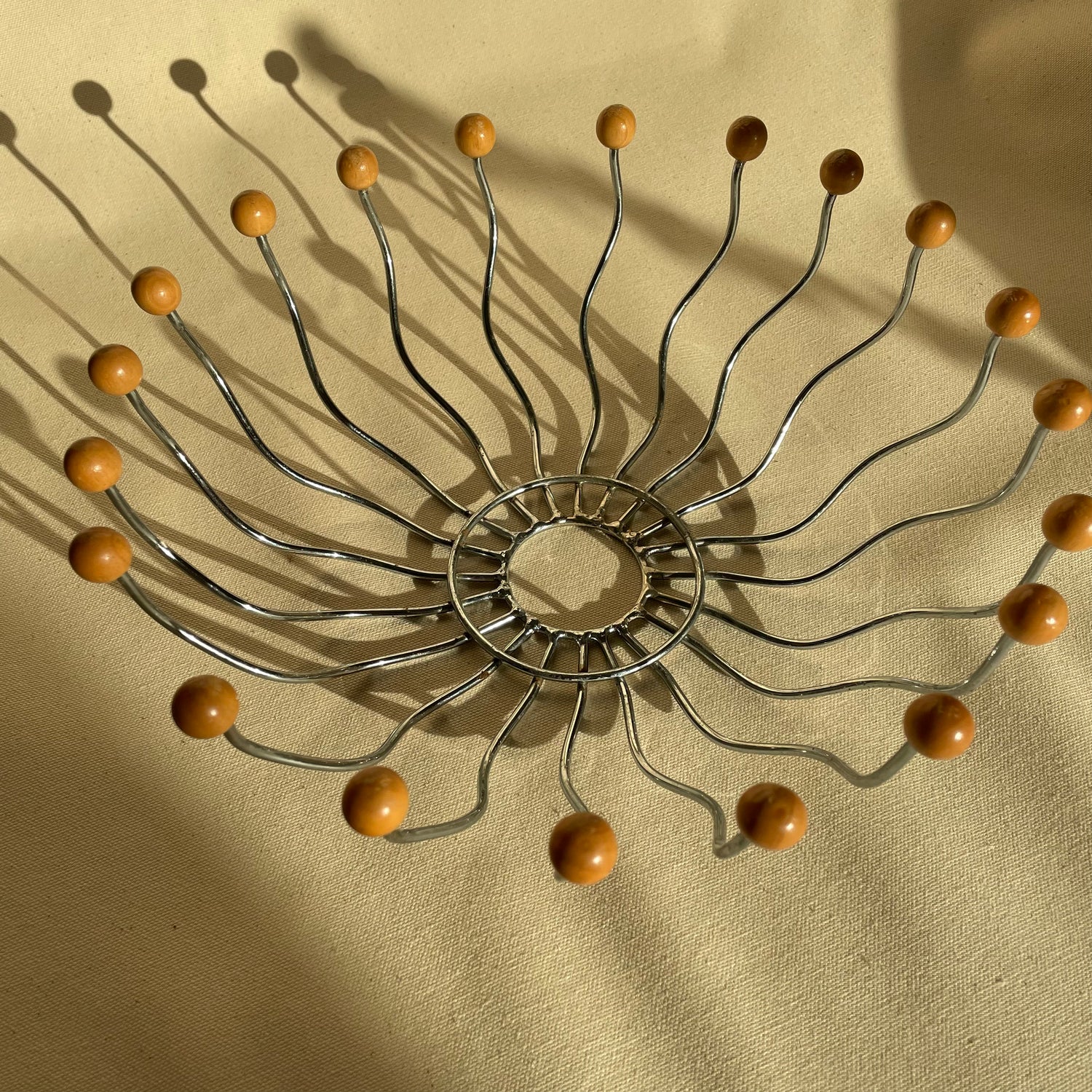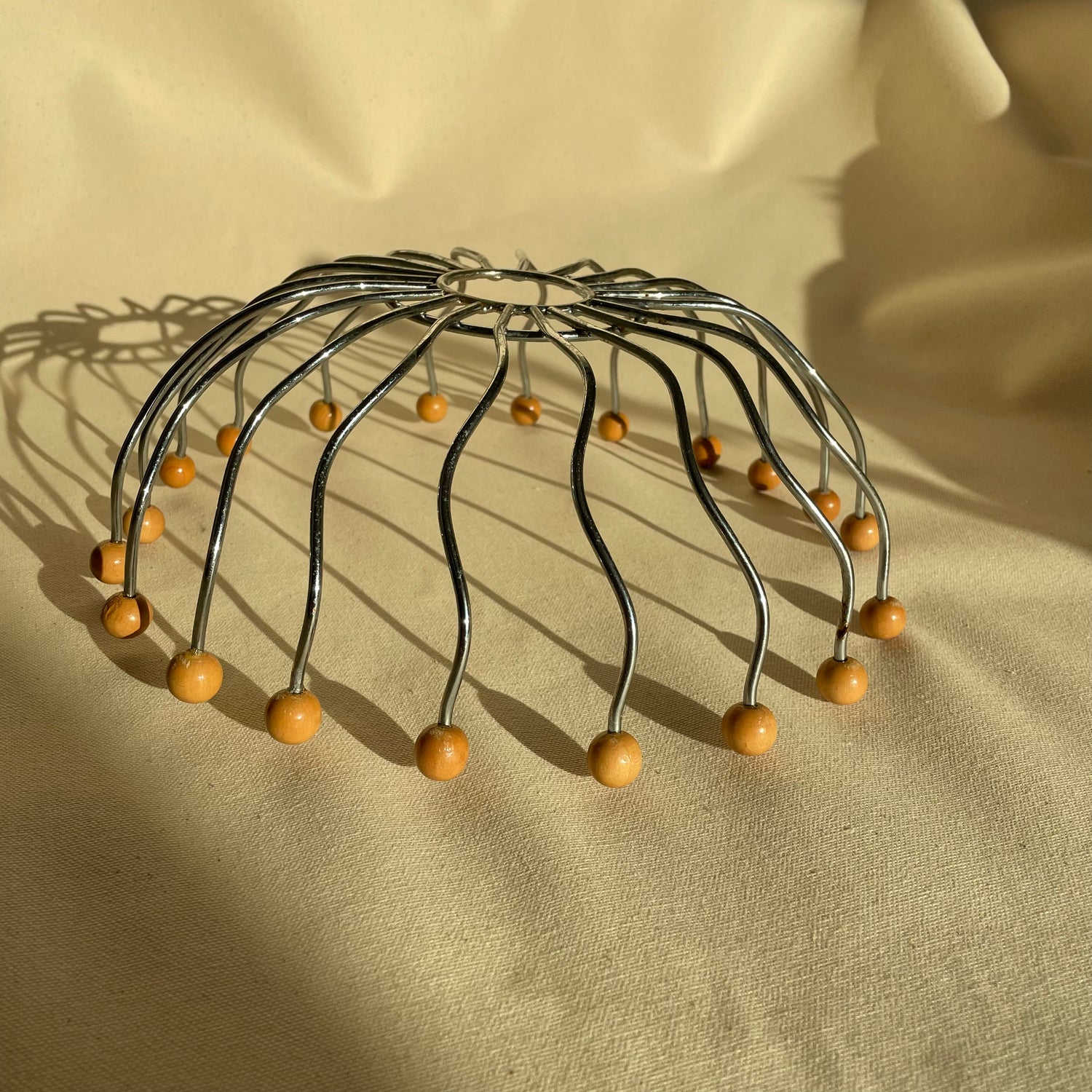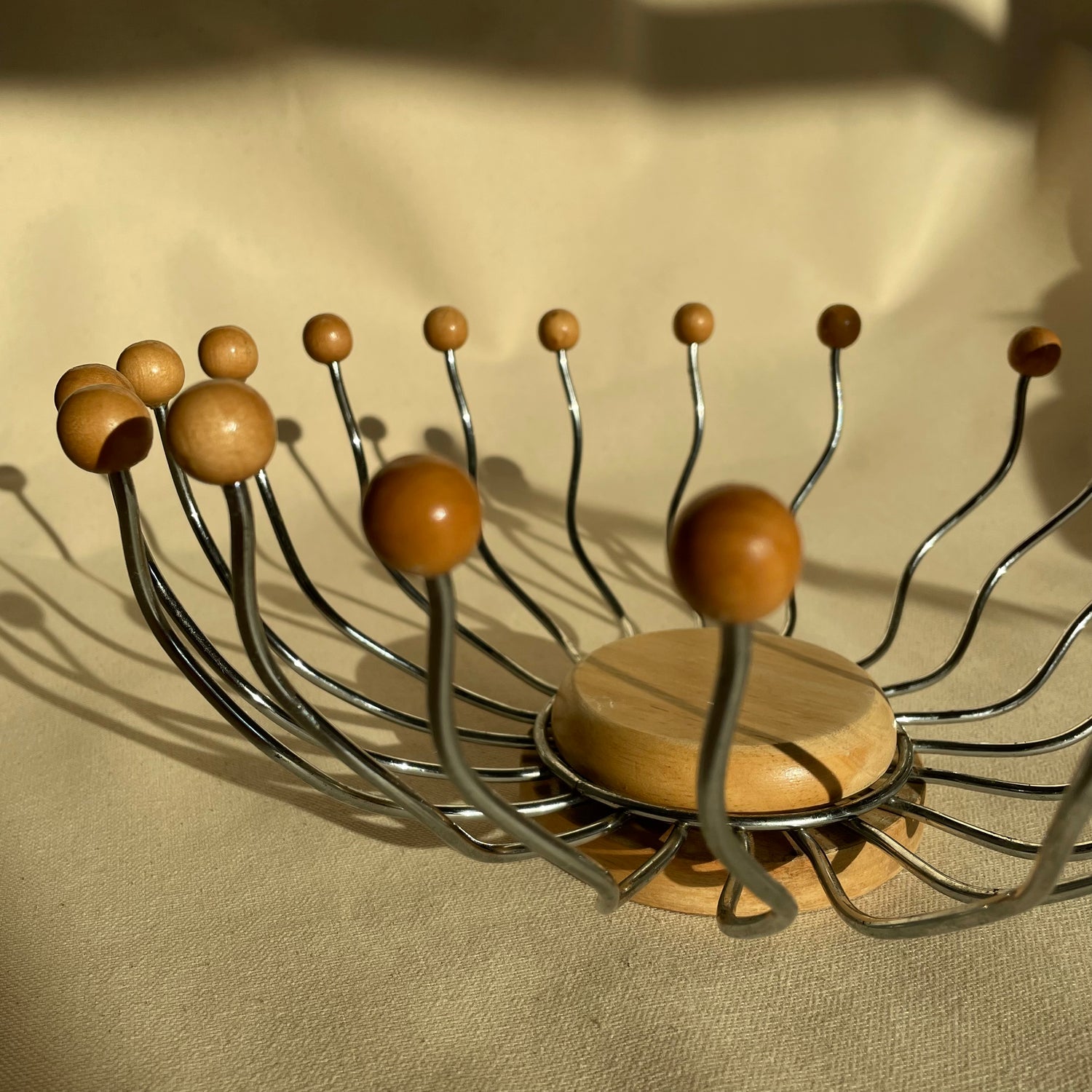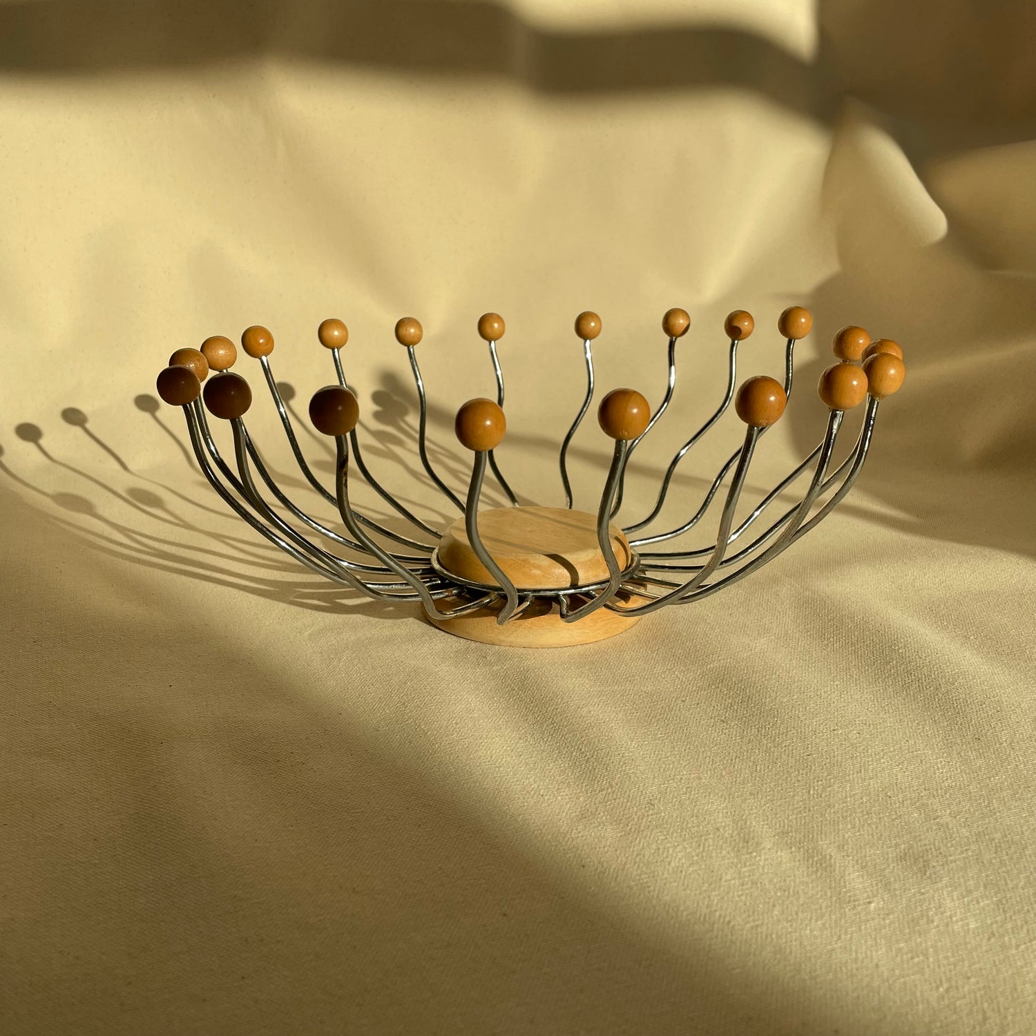 Wavy wire metal bowl shape with wood balls. Base is detachable. Most sold online come without. Rotates, spins like a lazy-susan.
