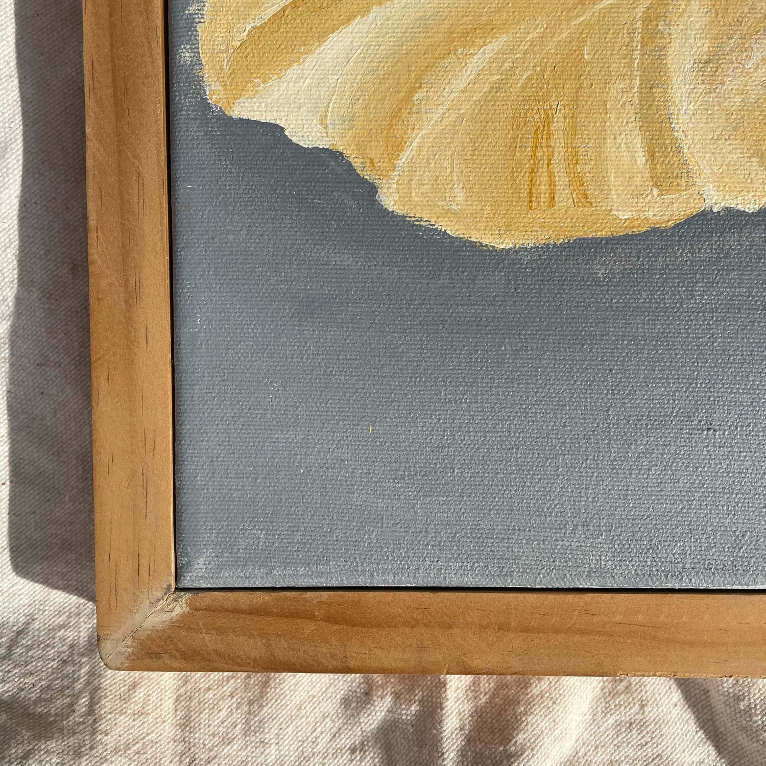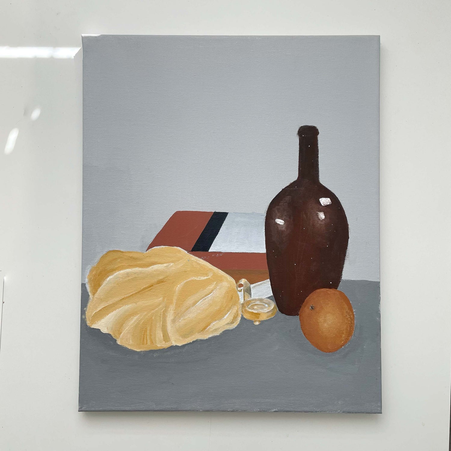 Hand painted still life of brown bottle and orange. Acrylic on canvas. The unexpected color palette gives modernism to a traditional still life. Unsigned.