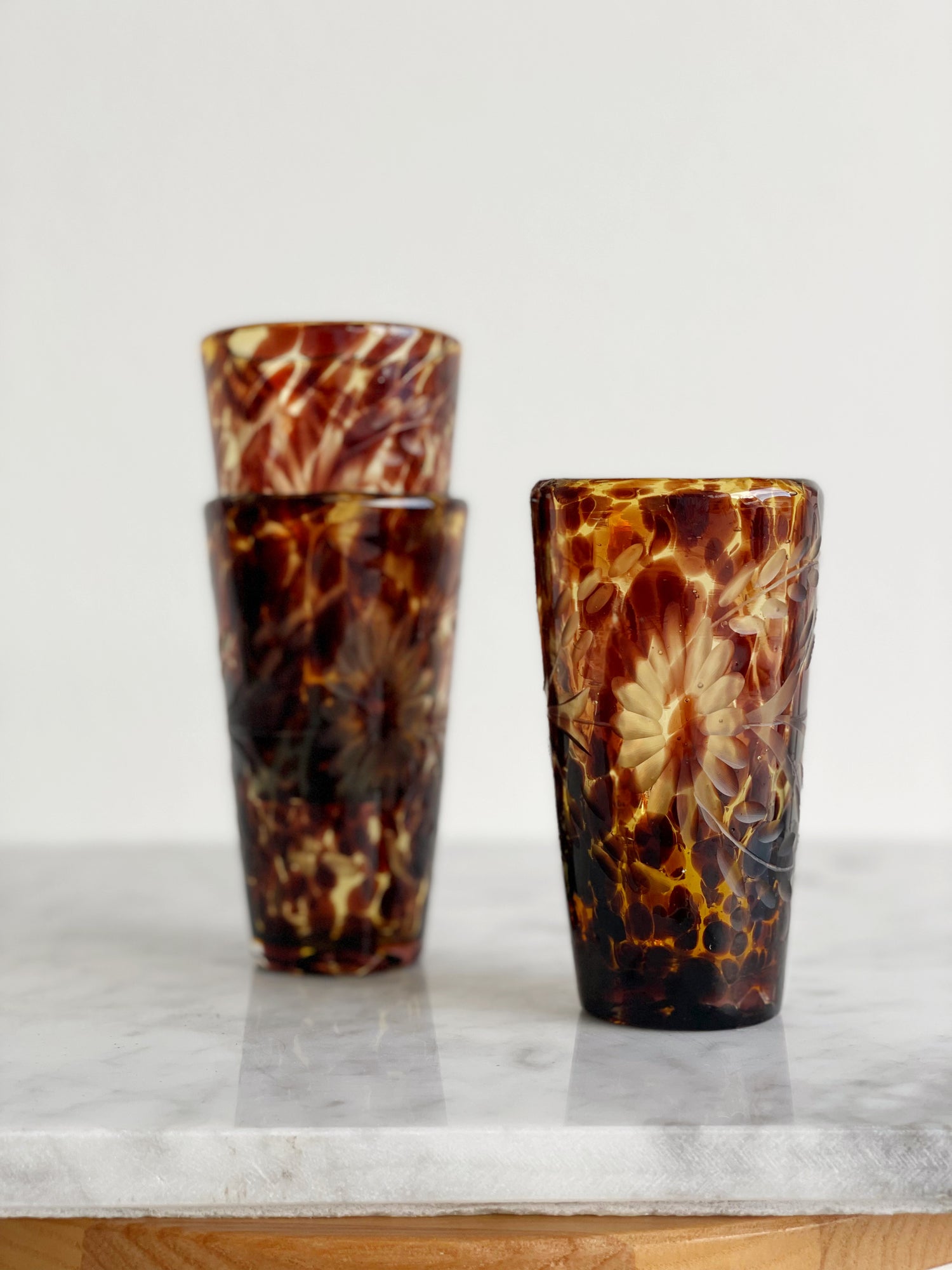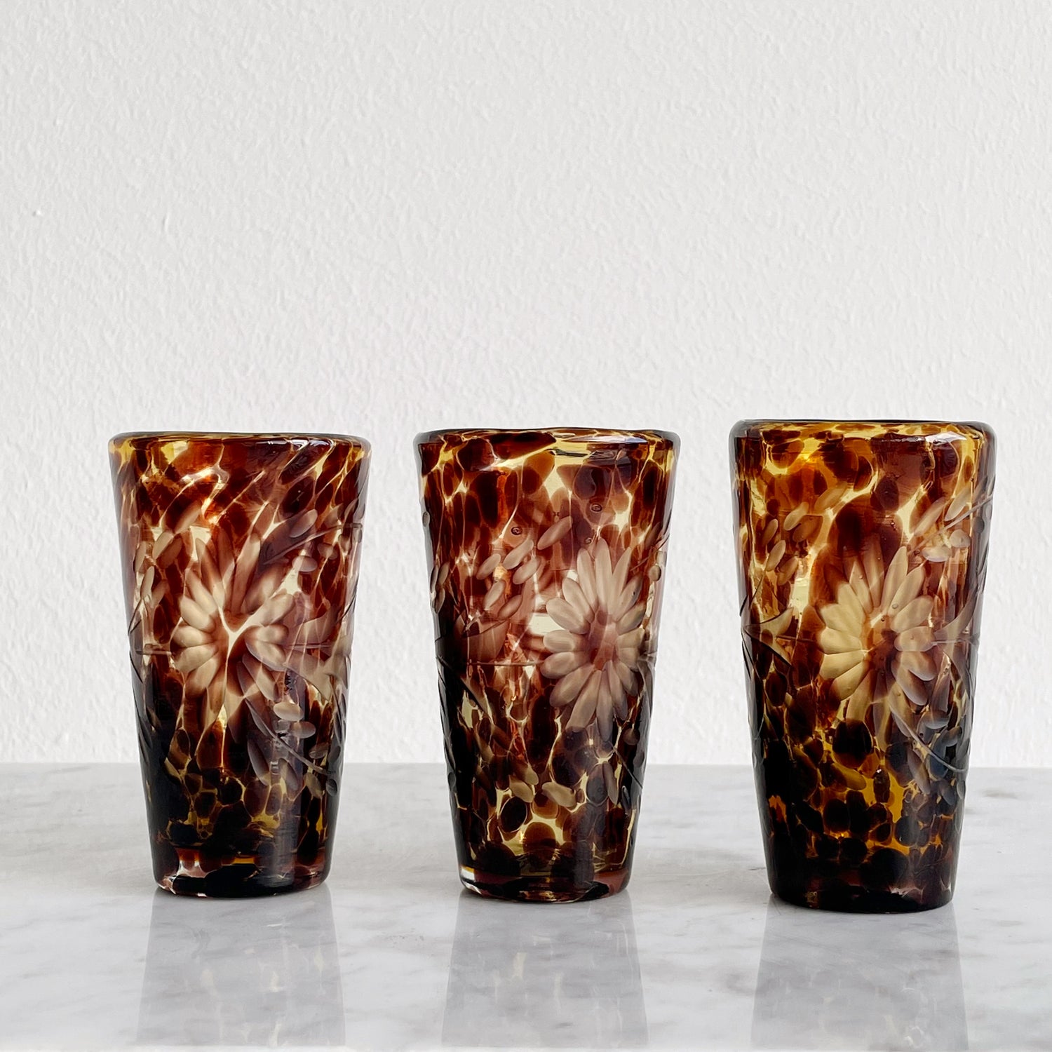 Etched Floral Hand Blown Tortoise Shell Tumblers x3
