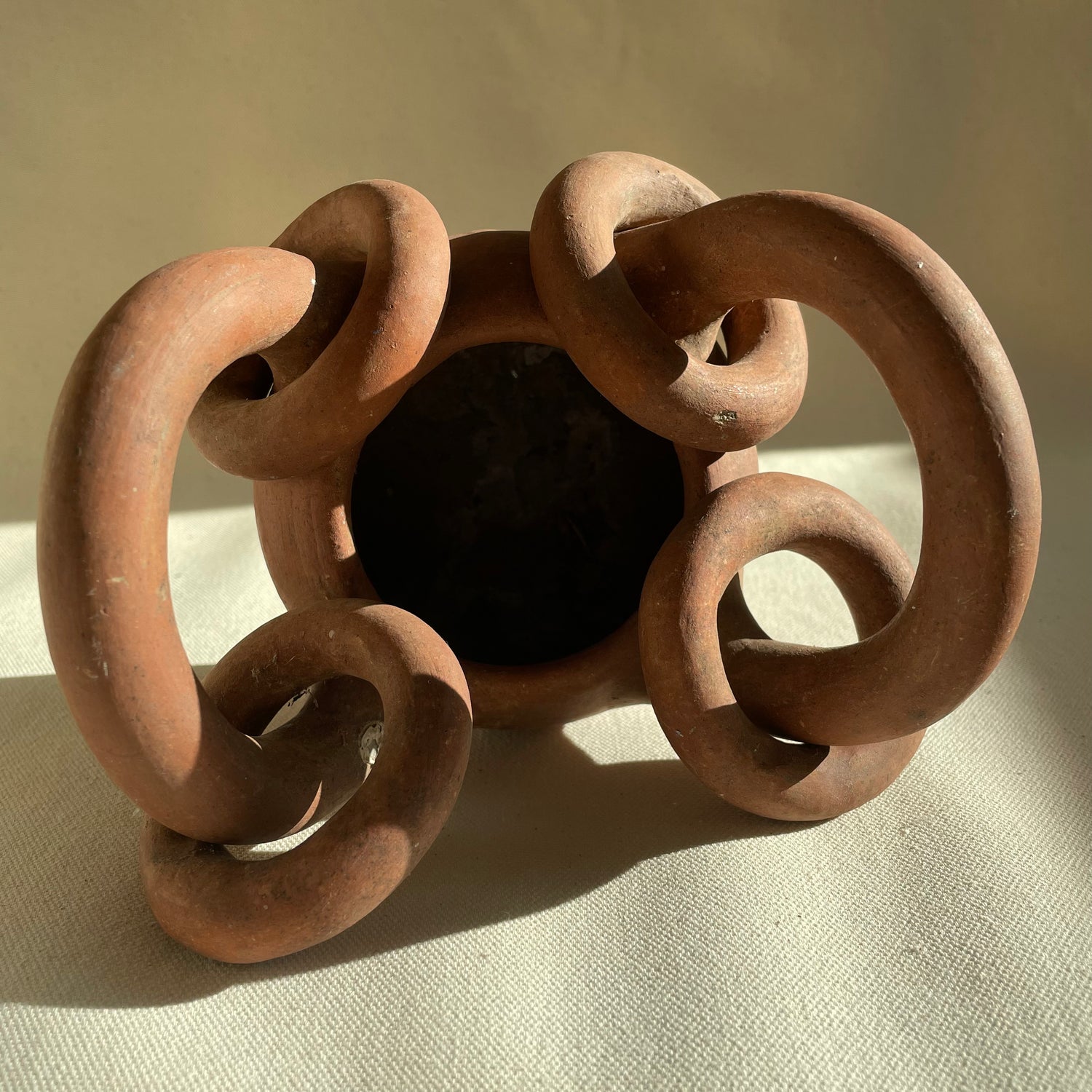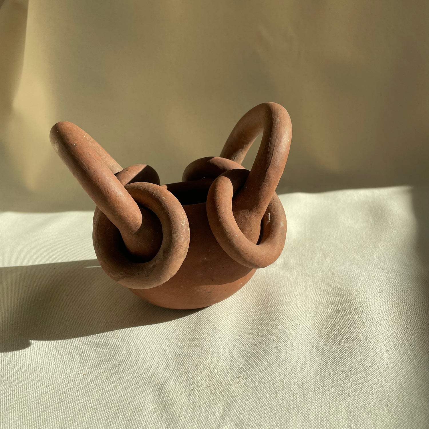 Made from terracotta red clay. Features 2 large handles with 4 rings, one on each end. Brutalist in style, unglazed vessel. Finish shows some wear. distressing from age. Add some texture to your decor.