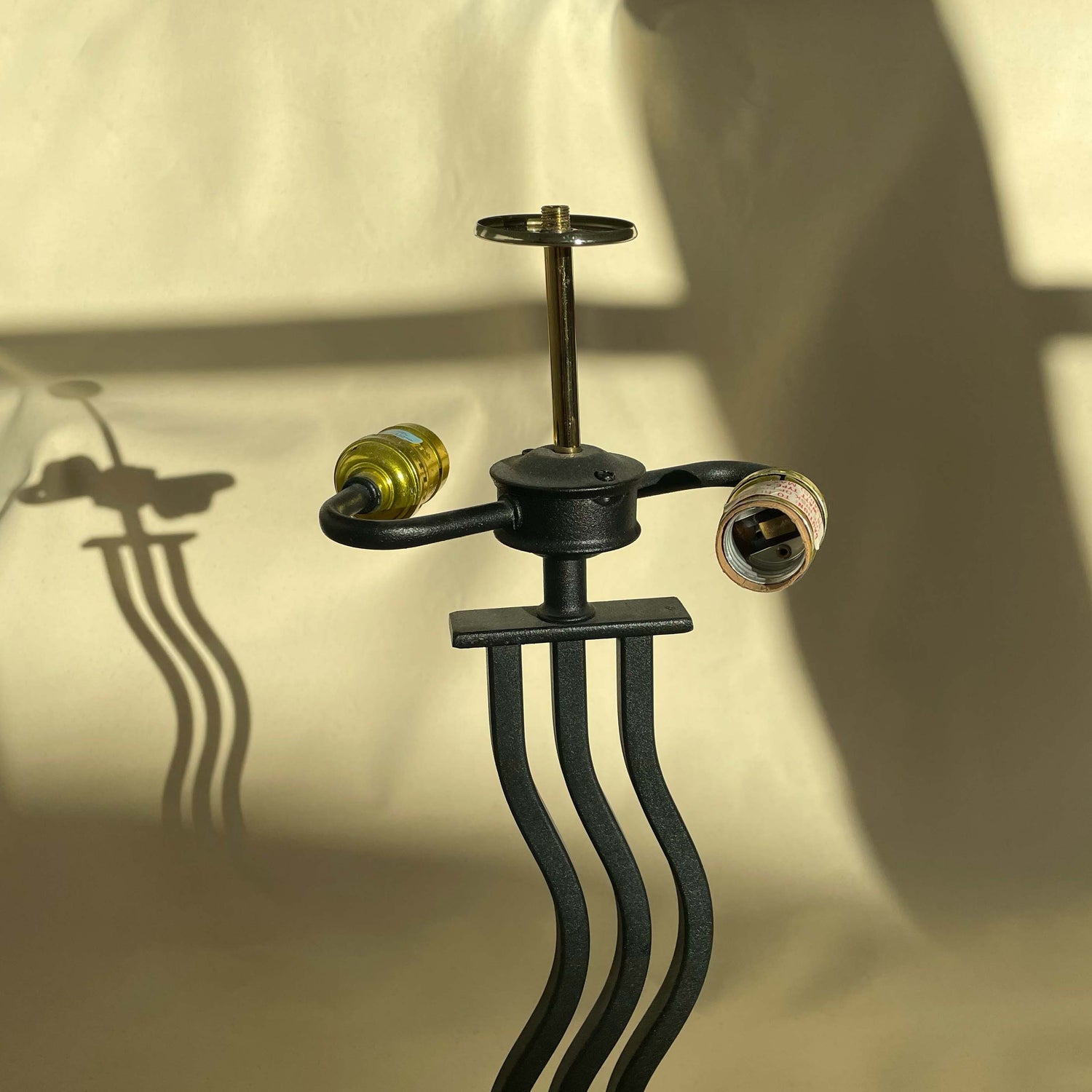 Vintage squiggle table lamp by Alsy. Memphis-style body featuring three parallel matte black tubular wavy bars. Original plastic shade, screws on securely. Plug-in lamp takes 2 standard bulbs, on/off switch.