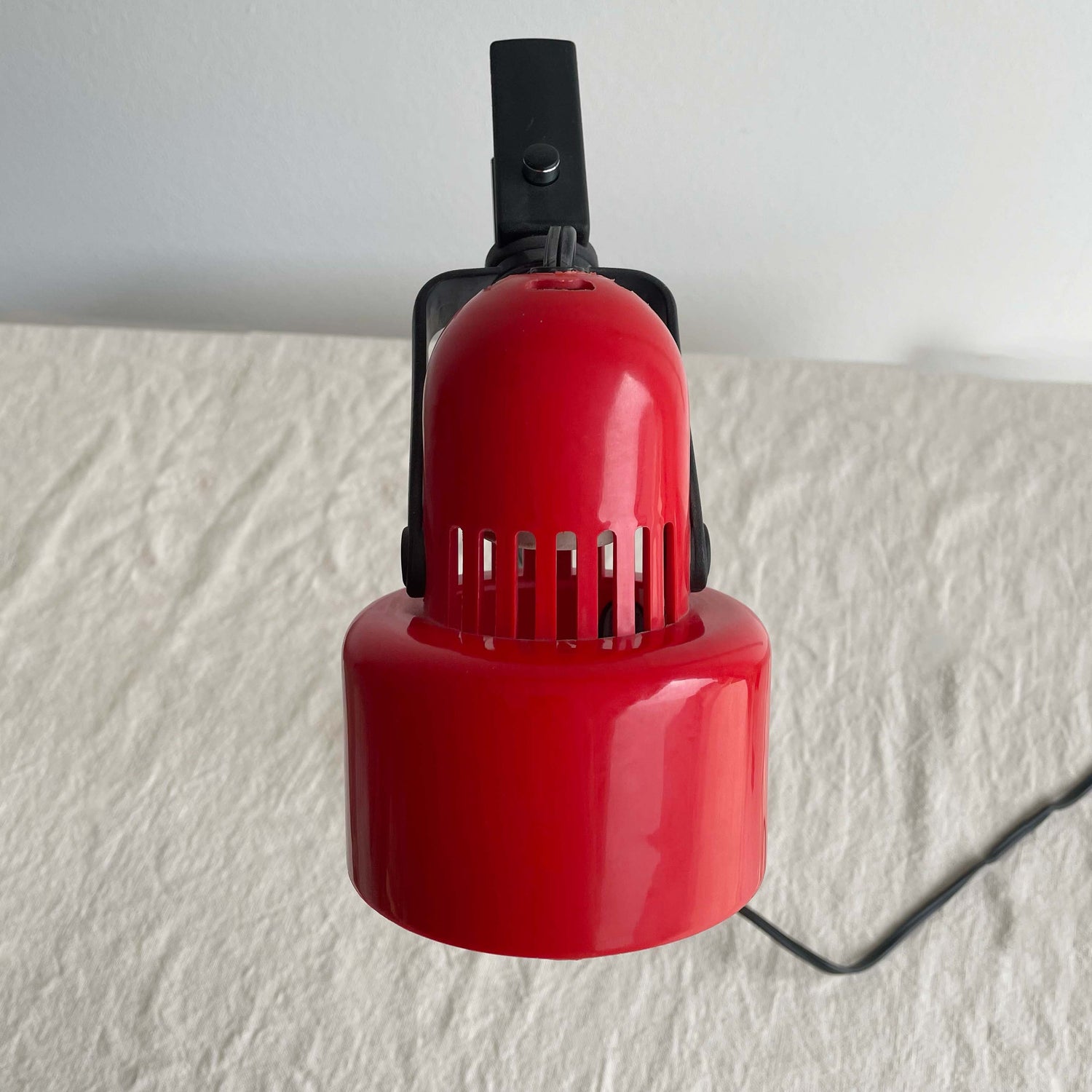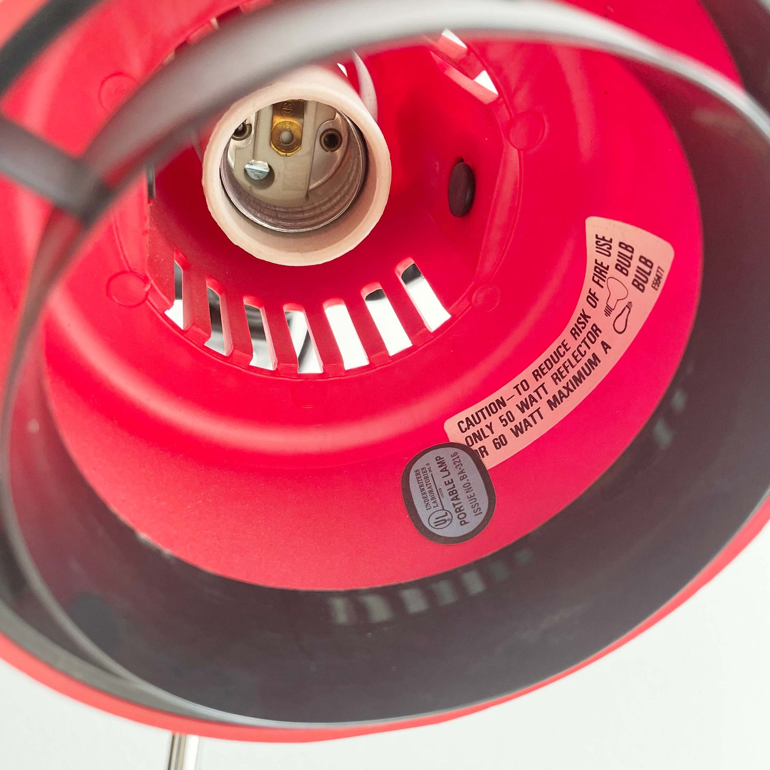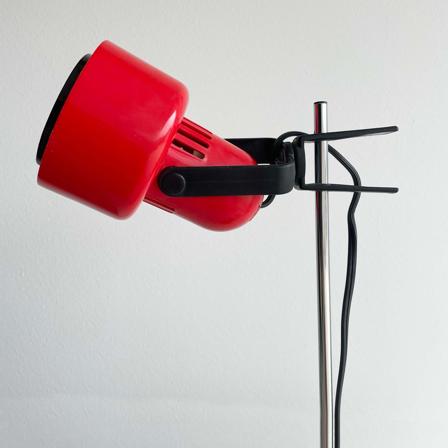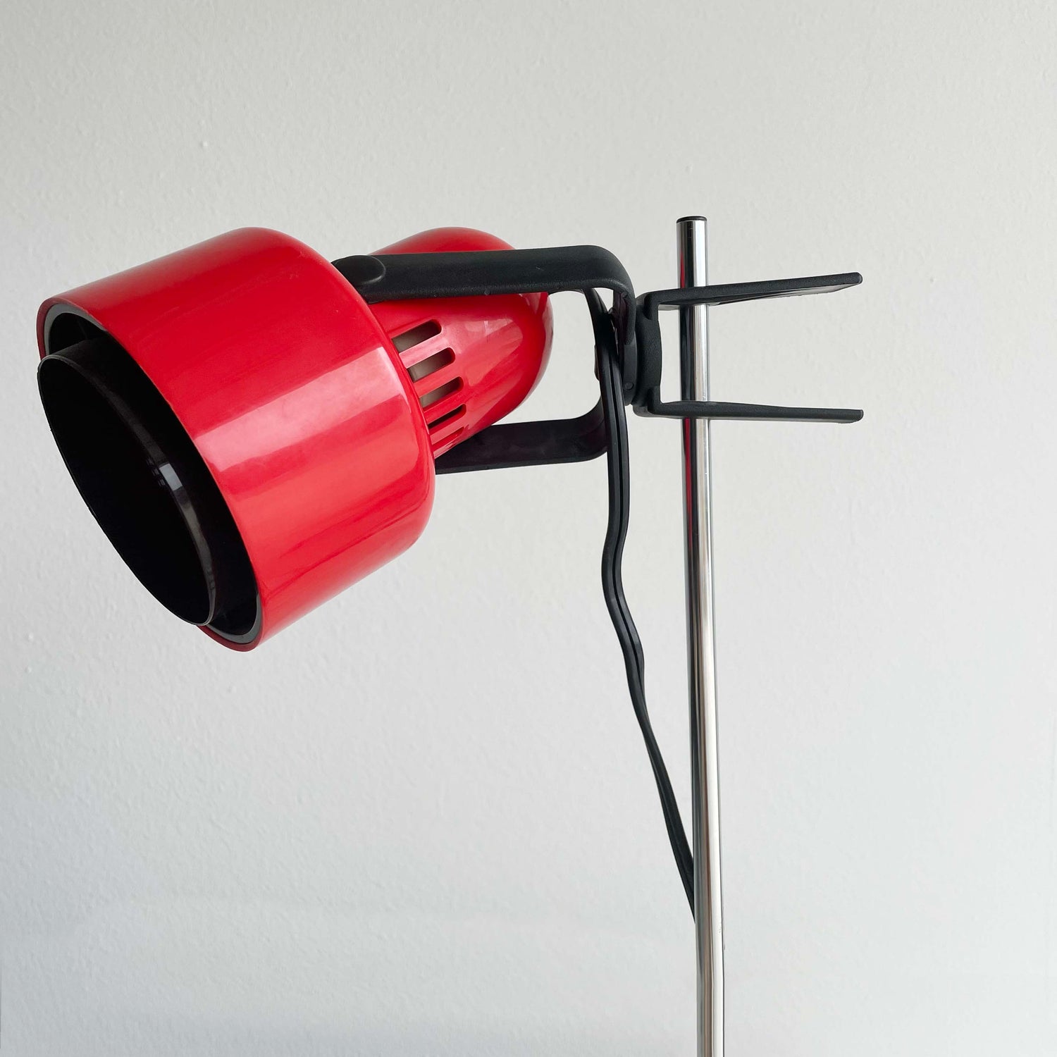 1980's bold red spotlight lamp. Plastic head with chrome rod and black metal base.