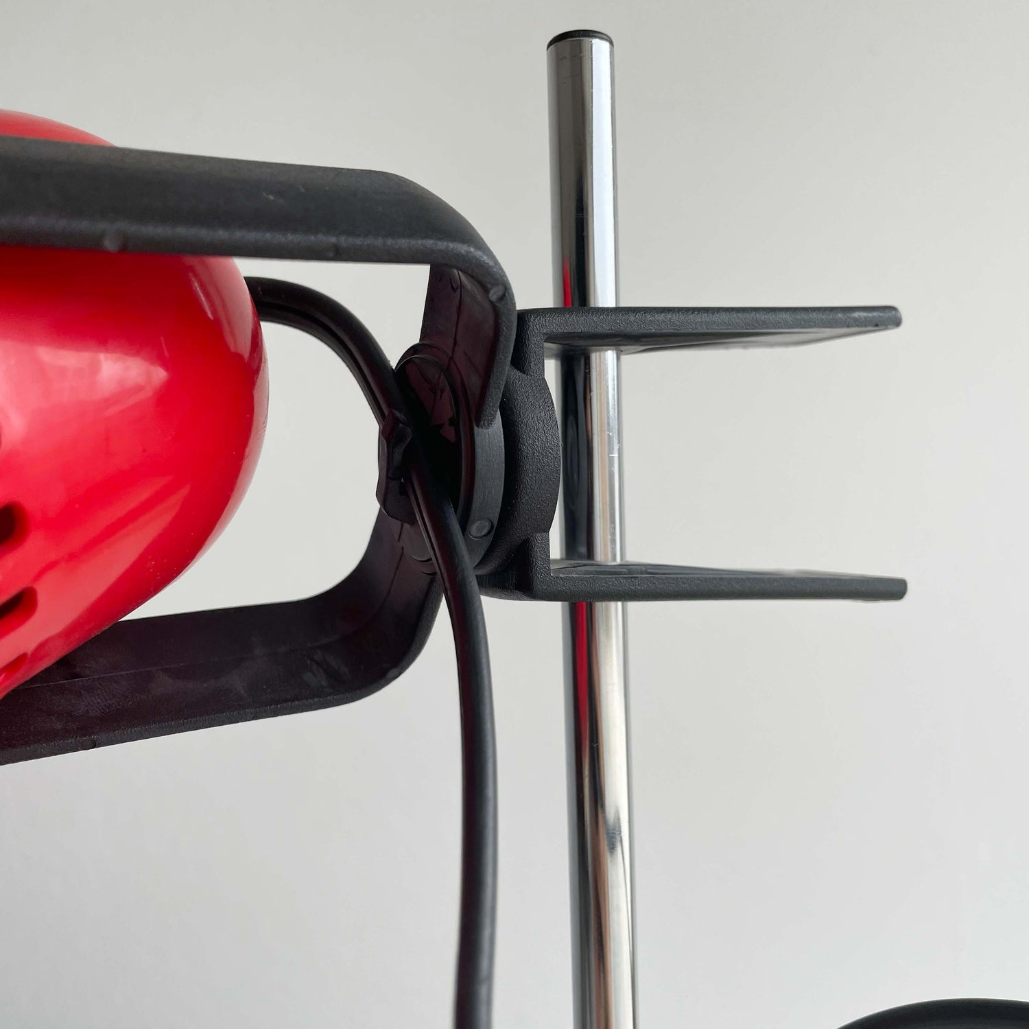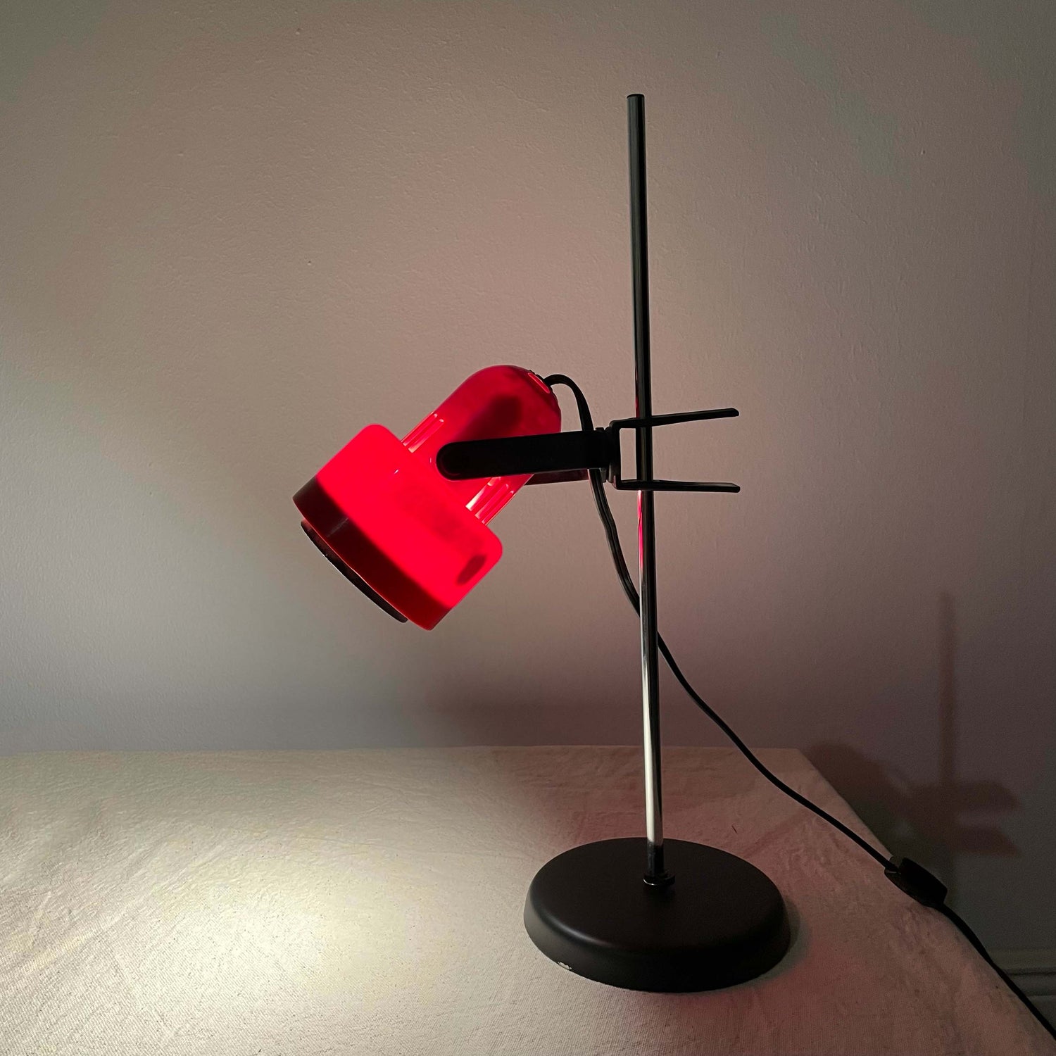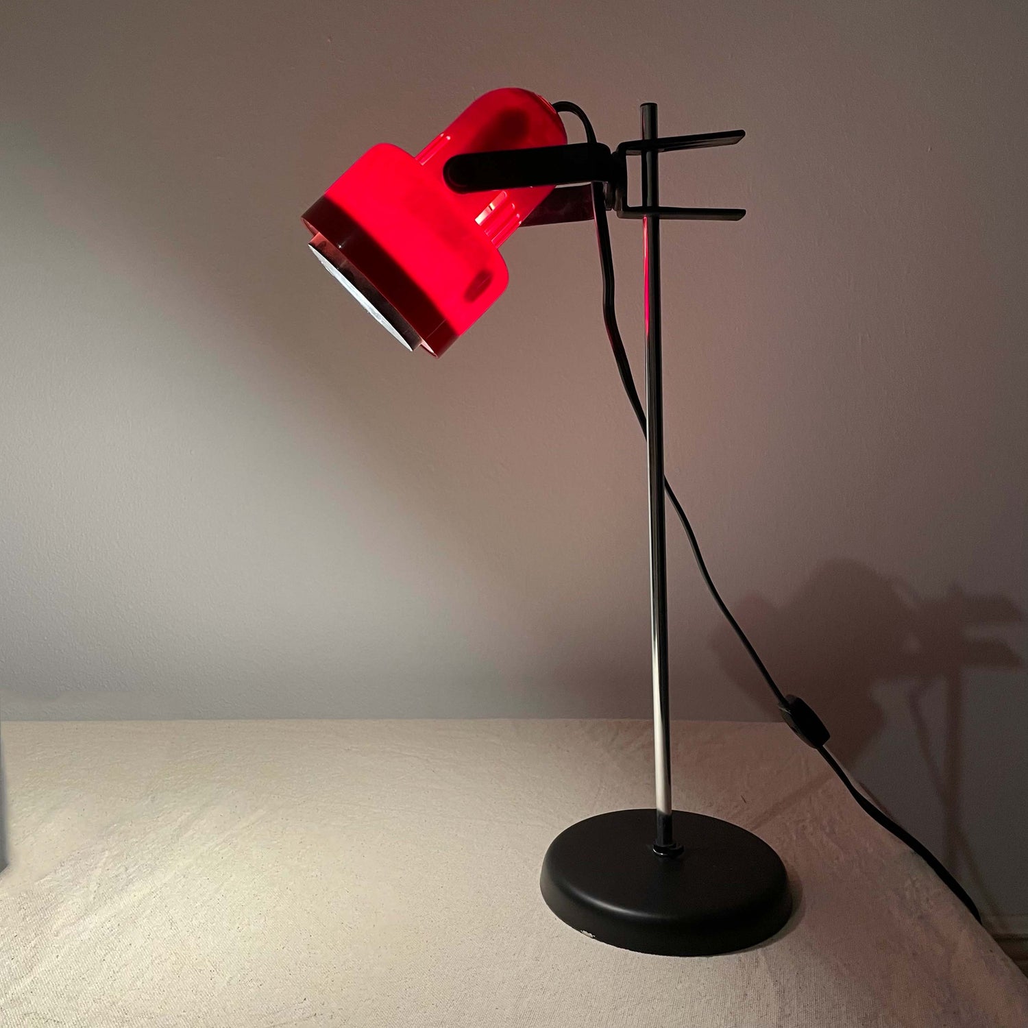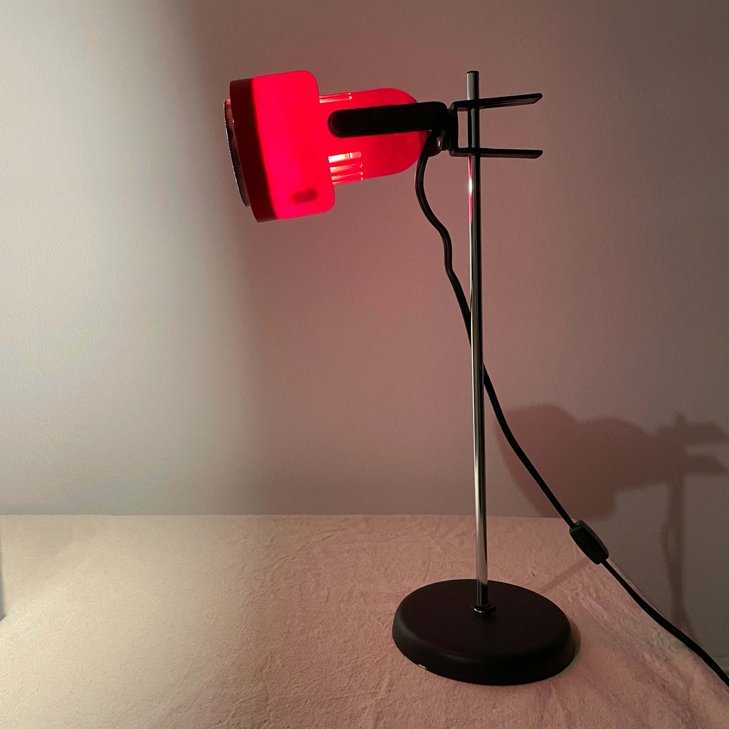 1980's bold red spotlight lamp. Plastic head with chrome rod and black metal base.