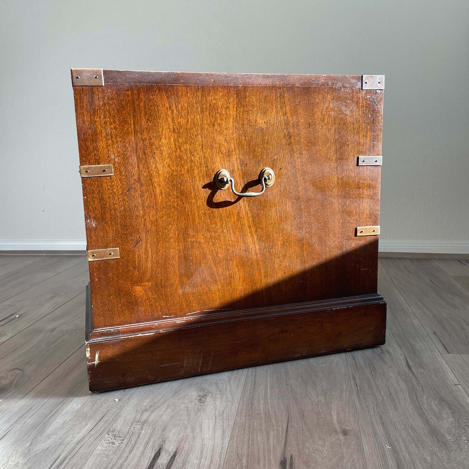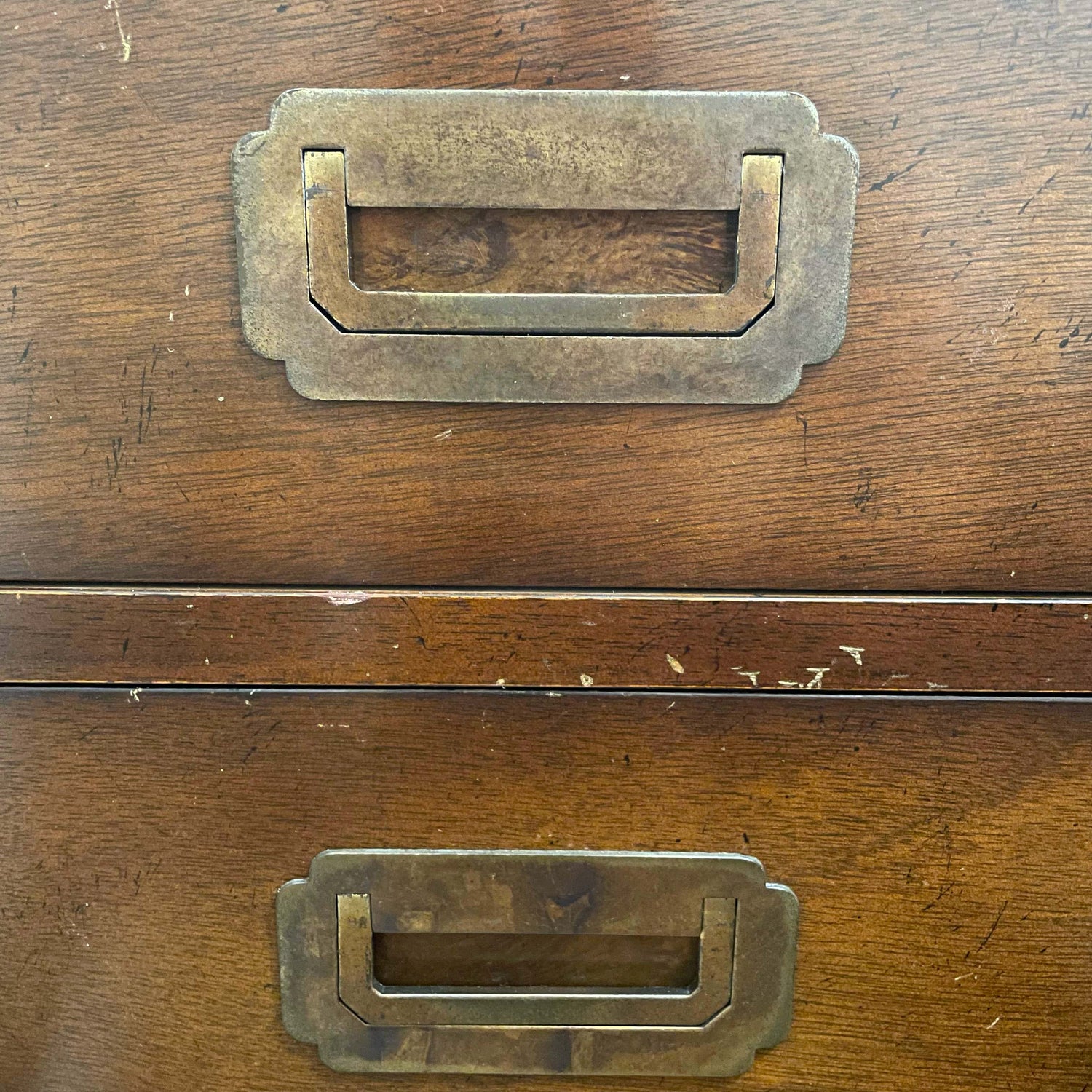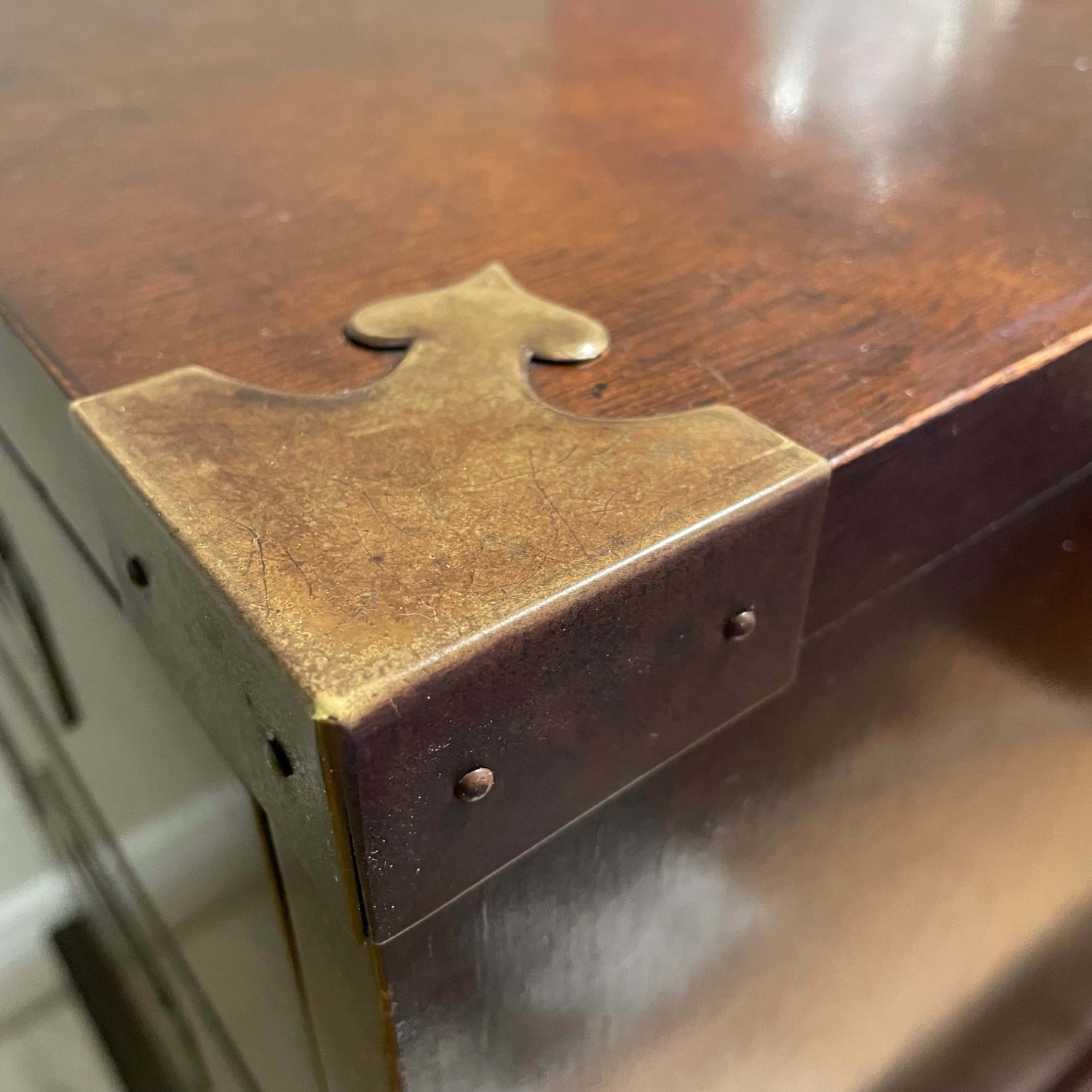 Single, vintage 3-drawer campaign style chests. Featuring: brass corners, strapping on all three drawers, baseboard molding and working lift handles.