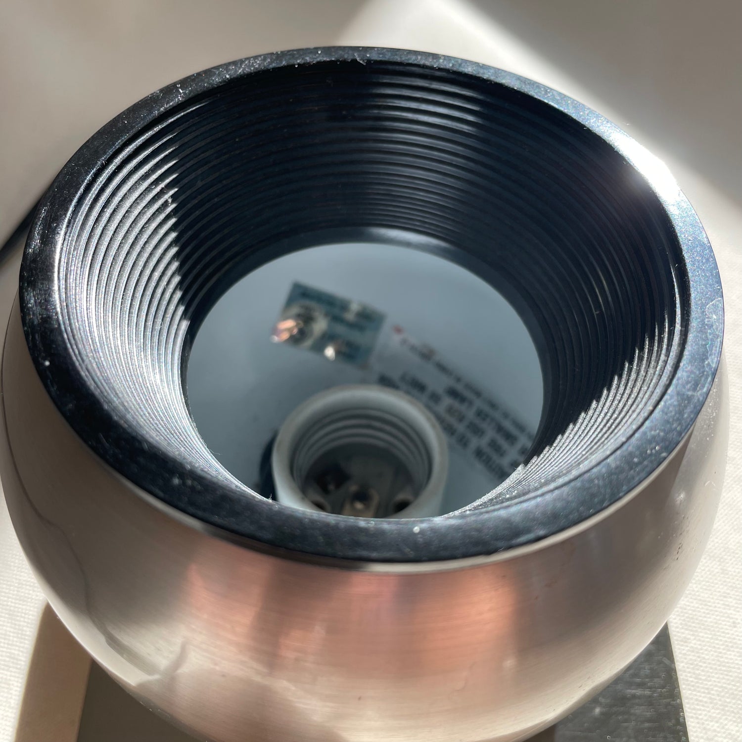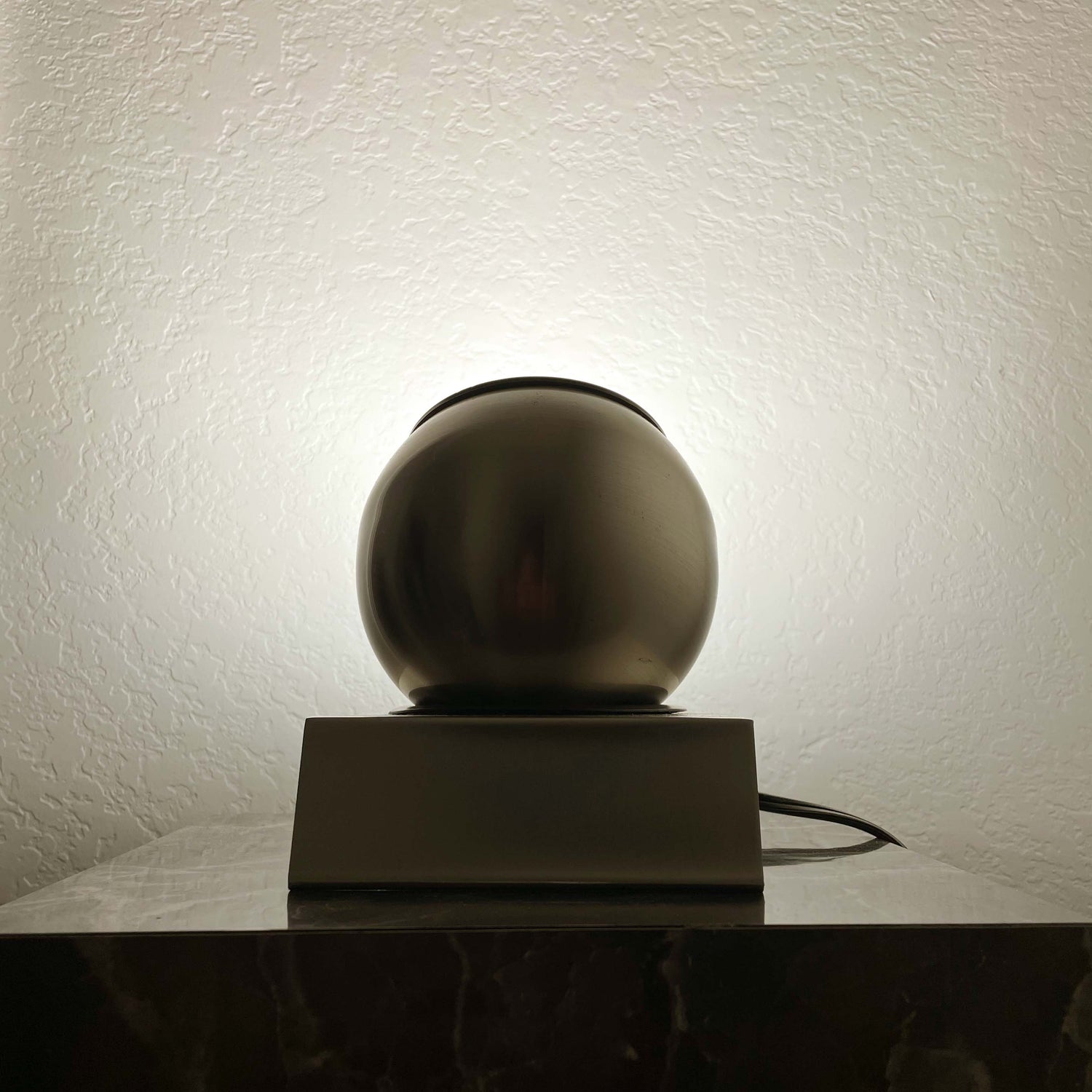 Mid-Century Robert Sonneman inspired Eyeball Desk Lamp in stainless steel. Orb has a black plastic insert and rests on a stainless metal base. The orb can be angled to project light. Nice mod accent light with switch on the cord. This light can be used on a table top and can be positioned to add lighting anywhere in your space t