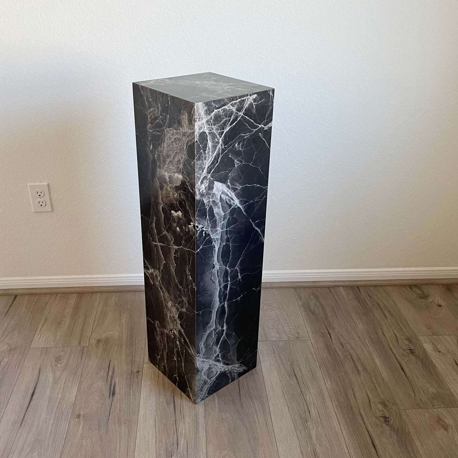 Vintage faux marble pedestal. Black, grey and white marble design. Excellent condition. No scratches or noticeable imperfections to call out on laminate. Regency, mid century, Eames era, art deco column podium.