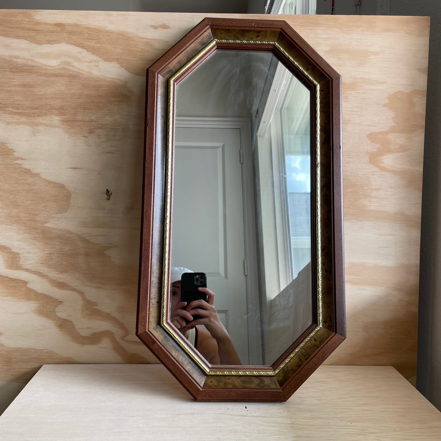 Beautiful vintage beveled mirror. Octagonal shape with burl, wood and gold frame. Minor signs of use appropriate to age. Crisp clear refection. You can place it vertically or horizontally as you like. Ready to hang. 12” W x 23”T