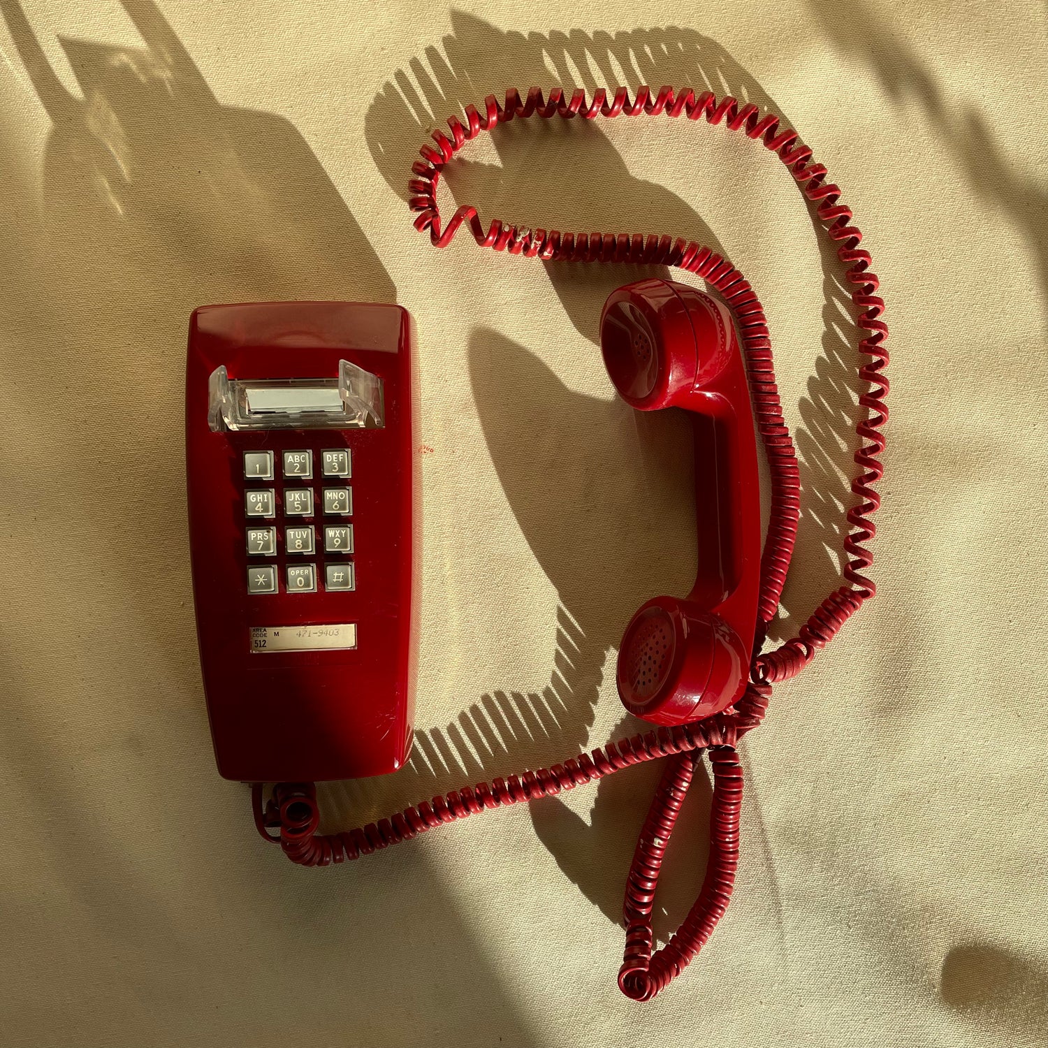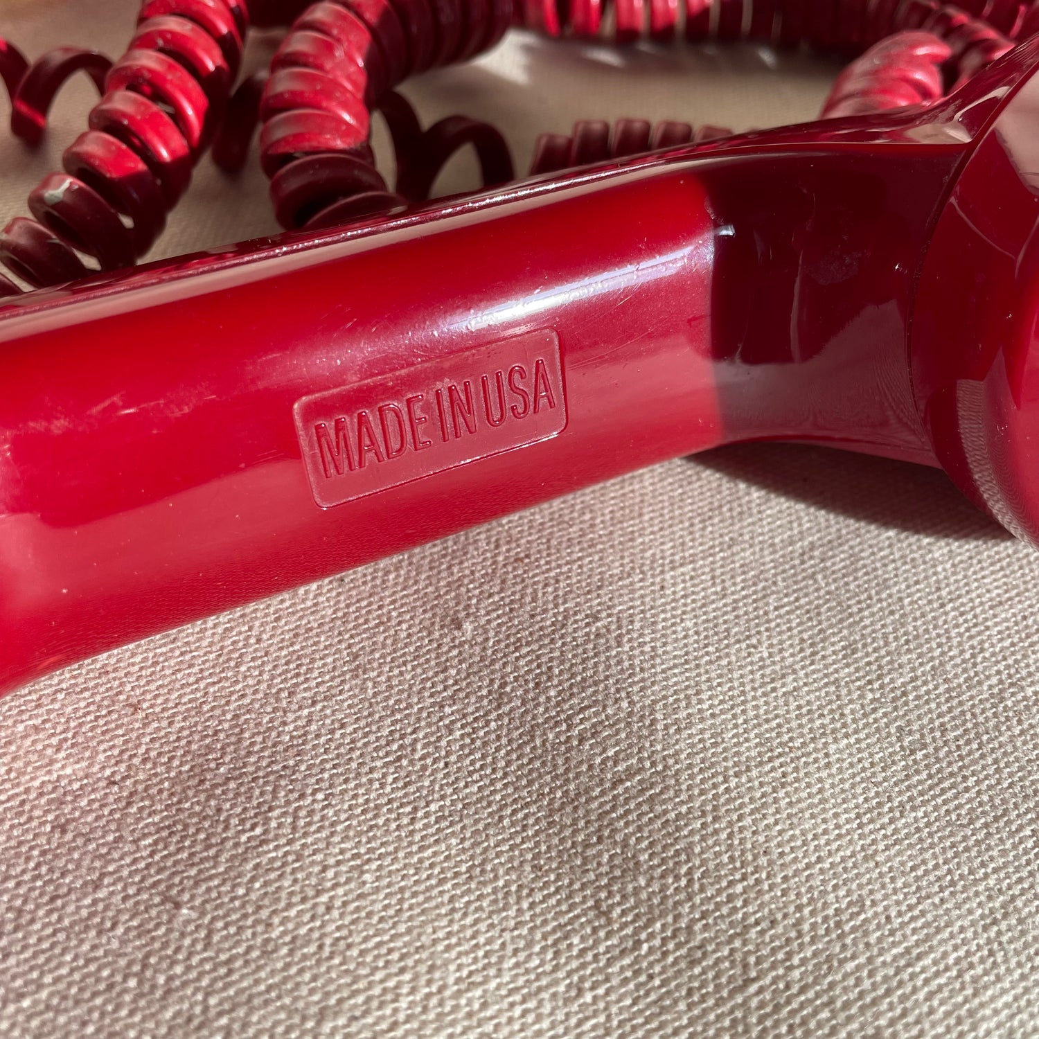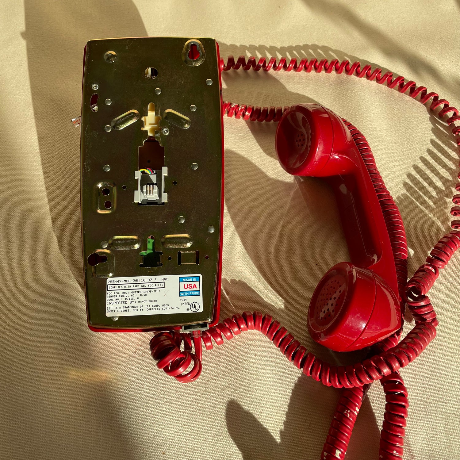 Ring, ring! It’s a push button, wall hung telephone. Extra long cord, so you can talk in your own room. Minor stretching throughout, appropriate to age. Hang in your kitchen for some extra sass. Made in USA.